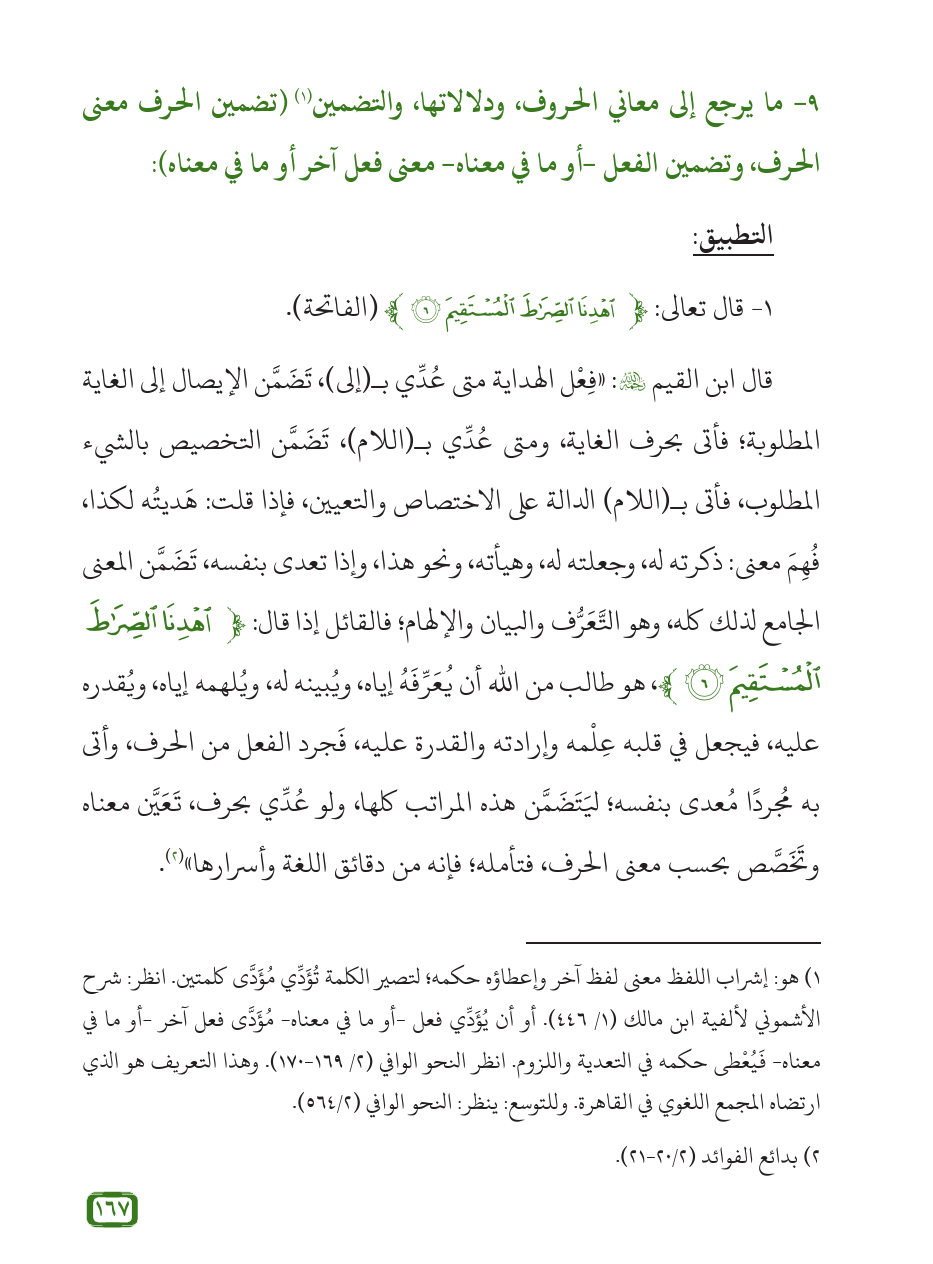 9 - ما يرجع إلى معاني الحروف، ودلالاتها، والتضمين (¬1) (تضمين الحرف معنى الحرف، وتضمين الفعل -أو ما في معناه- معنى فعل آخر أو ما في معناه):