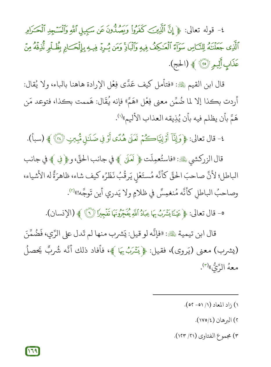 قال ابن القيم - رحمه الله -: «فتأمل كيف عَدَّى فِعْل الإرادة هاهنا بالباء، ولا يُقال: أردت بكذا إلا لما ضُمِّن معنى فِعْل «هَمَّ» فإنه يُقَال: هَممت بكذا، فتوعد مَن هَمَّ بأن يظلم فيه بأن يُذِيقه العذاب الأليم» (¬1). 4 - قال تعالى: {وَإِنَّا أَوْ إِيَّاكُمْ لَعَلَى هُدًى أَوْ فِي ضَلَالٍ مُبِينٍ (24)} (سبأ).