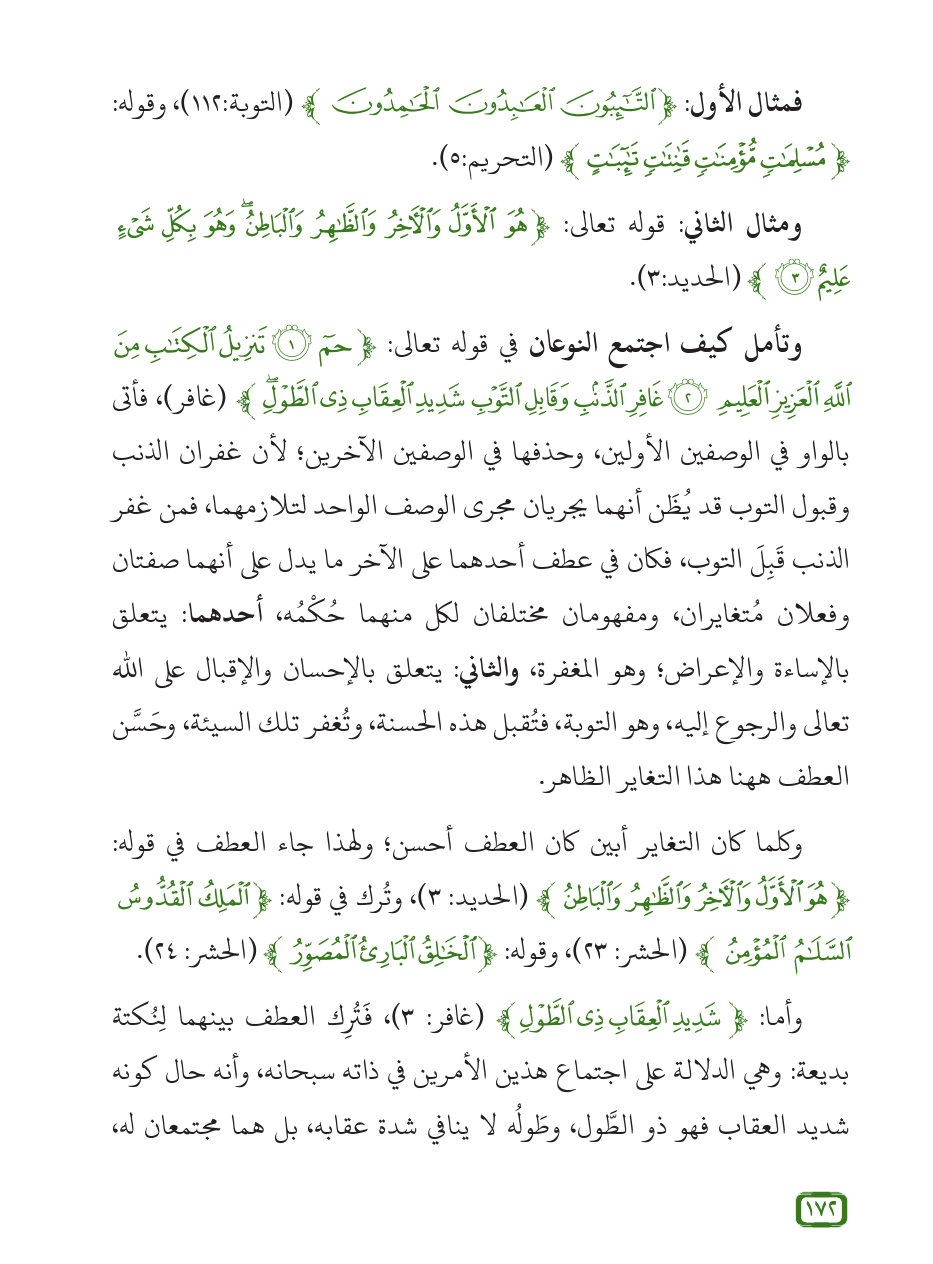 وكلما كان التغاير أبين كان العطف أحسن؛ ولهذا جاء العطف في قوله: {هُوَ الْأَوَّلُ وَالْآخِرُ وَالظَّاهِرُ وَالْبَاطِنُ} (الحديد: 3)، وتُرك في قوله: {الْمَلِكُ الْقُدُّوسُ السَّلَامُ الْمُؤْمِنُ} (الحشر: 23)، وقوله: {الْخَالِقُ الْبَارِئُ الْمُصَوِّرُ} (الحشر: 24).