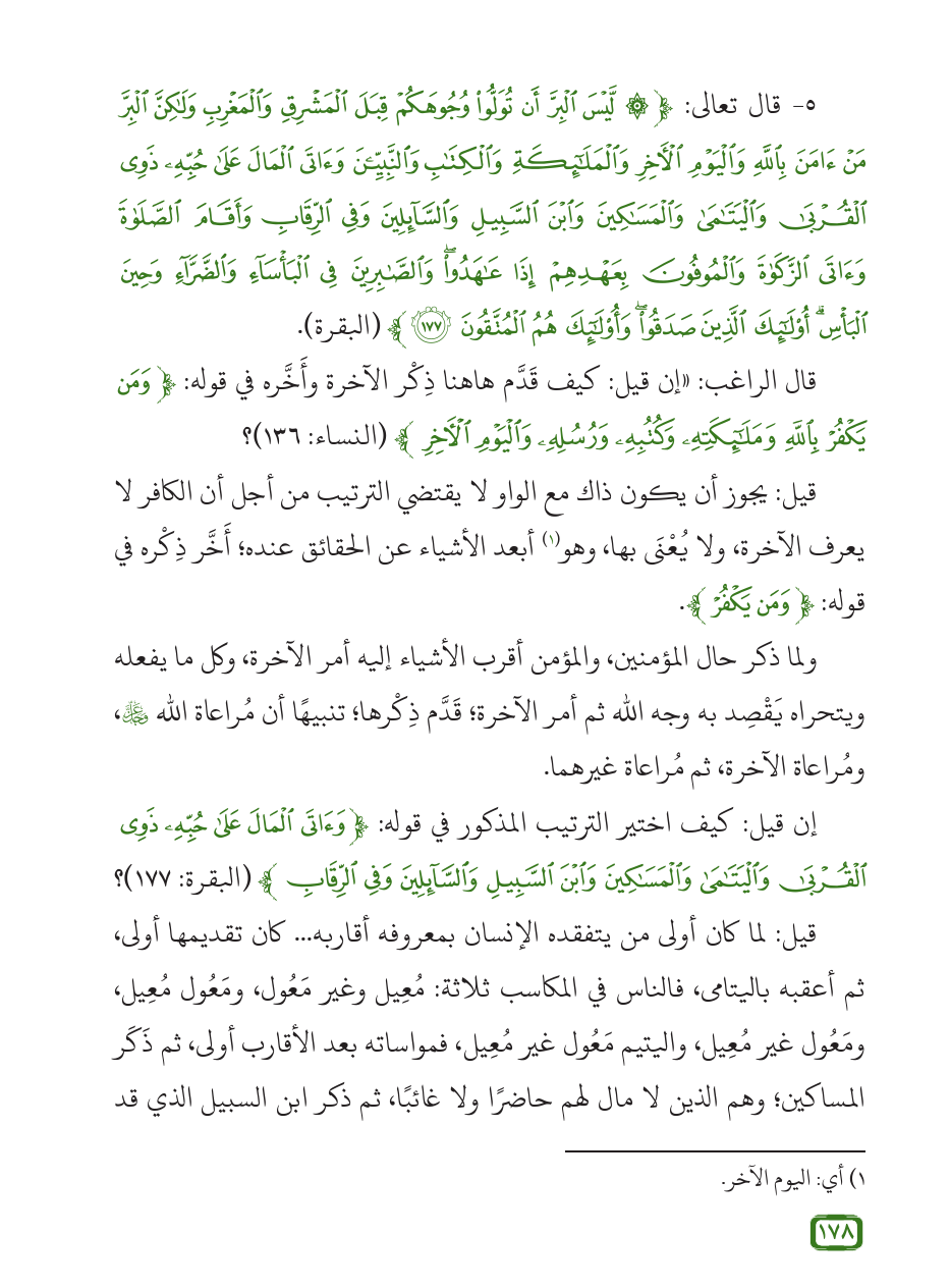 إن قيل: كيف اختير الترتيب المذكور في قوله: {وَآتَى الْمَالَ عَلَى حُبِّهِ ذَوِي الْقُرْبَى وَالْيَتَامَى وَالْمَسَاكِينَ وَابْنَ السَّبِيلِ وَالسَّائِلِينَ وَفِي الرِّقَابِ} (البقرة: 177)؟