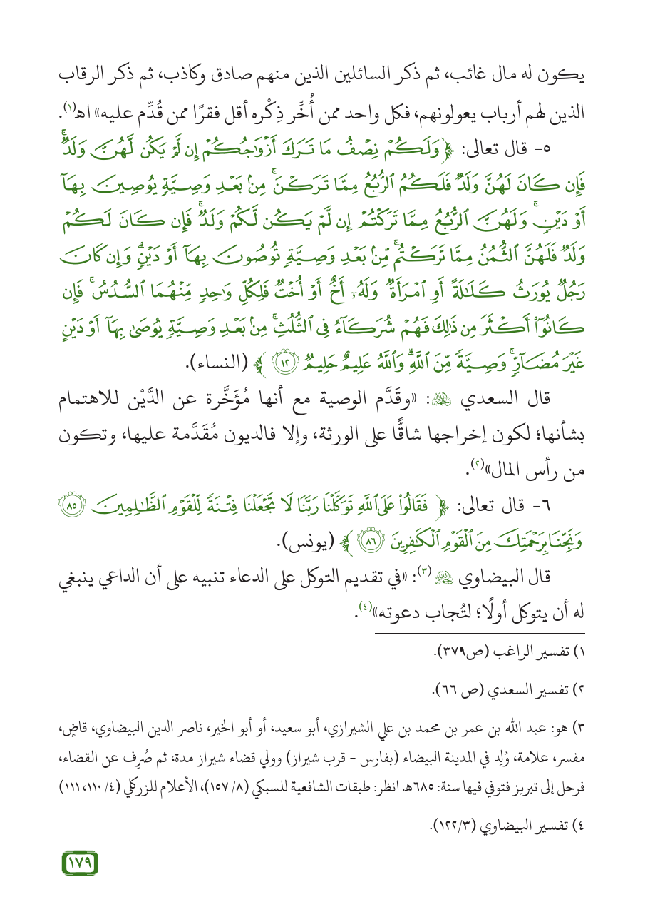 5 - قال تعالى: {وَلَكُمْ نِصْفُ مَا تَرَكَ أَزْوَاجُكُمْ إِنْ لَمْ يَكُنْ لَهُنَّ وَلَدٌ فَإِنْ كَانَ لَهُنَّ وَلَدٌ فَلَكُمُ الرُّبُعُ مِمَّا تَرَكْنَ مِنْ بَعْدِ وَصِيَّةٍ يُوصِينَ بِهَا أَوْ دَيْنٍ وَلَهُنَّ الرُّبُعُ مِمَّا تَرَكْتُمْ إِنْ لَمْ يَكُنْ لَكُمْ وَلَدٌ فَإِنْ كَانَ لَكُمْ وَلَدٌ فَلَهُنَّ الثُّمُنُ مِمَّا تَرَكْتُمْ مِنْ بَعْدِ وَصِيَّةٍ تُوصُونَ بِهَا أَوْ دَيْنٍ وَإِنْ كَانَ رَجُلٌ يُورَثُ كَلَالَةً أَوِ امْرَأَةٌ وَلَهُ أَخٌ أَوْ أُخْتٌ فَلِكُلِّ وَاحِدٍ مِنْهُمَا السُّدُسُ فَإِنْ كَانُوا أَكْثَرَ مِنْ ذَلِكَ فَهُمْ شُرَكَاءُ فِي الثُّلُثِ مِنْ بَعْدِ وَصِيَّةٍ يُوصَى بِهَا أَوْ دَيْنٍ غَيْرَ مُضَارٍّ وَصِيَّةً مِنَ اللَّهِ وَاللَّهُ عَلِيمٌ حَلِيمٌ (12)} (النساء).