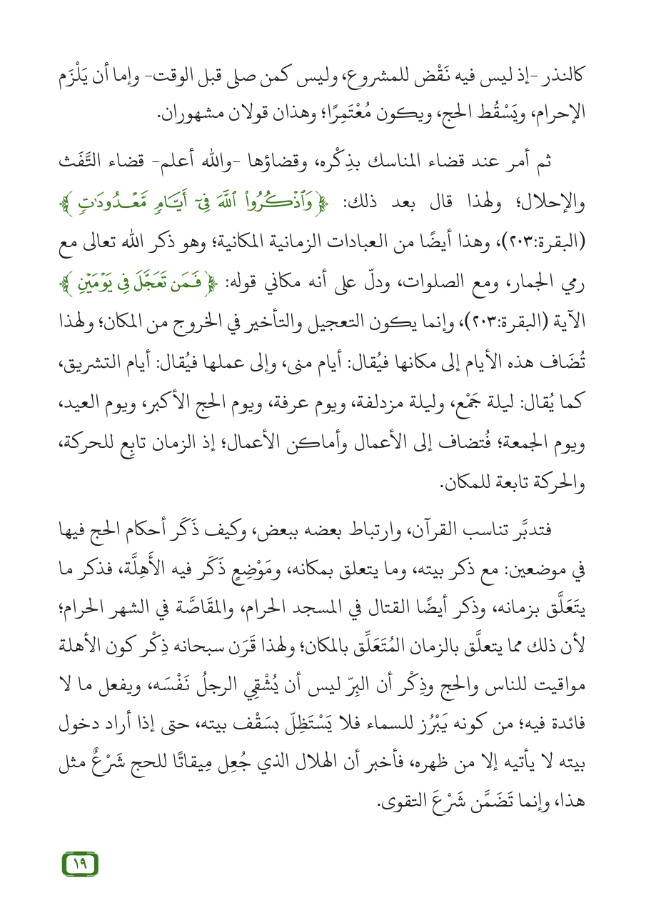 فتدبَّر تناسب القرآن، وارتباط بعضه ببعض، وكيف ذَكَر أحكام الحج فيها في موضعين: مع ذكر بيته، وما يتعلق بمكانه، ومَوْضِعٍ ذَكَر فيه الأَهِلَّة، فذكر ما يتَعَلَّق بزمانه، وذكر أيضًا القتال في المسجد الحرام، والمقَاصَّة في الشهر الحرام؛ لأن ذلك مما يتعلَّق بالزمان المُتَعَلِّق بالمكان؛ ولهذا قَرَن سبحانه ذِكْر كون الأهلة مواقيت للناس والحج وذِكْر أن البِرّ ليس أن يُشْقِي الرجلُ نَفْسَه، ويفعل ما لا فائدة فيه؛ من كونه يَبْرُز للسماء فلا يَسْتَظِلّ بسَقْف بيته، حتى إذا أراد دخول بيته لا يأتيه إلا من ظهره، فأخبر أن الهلال الذي جُعِل مِيقاتًا للحج شَرْعٌ مثل هذا، وإنما تَضَمَّن شَرْعَ التقوى.