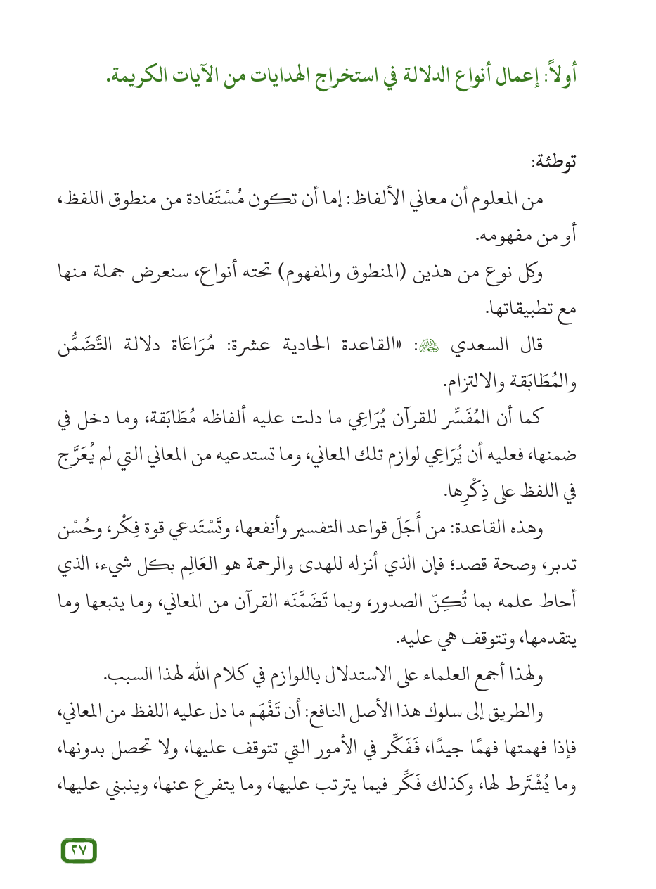 قال السعدي - رحمه الله -: «القاعدة الحادية عشرة: مُرَاعَاة دلالة التَّضَمُّن والمُطَابَقة والالتزام.