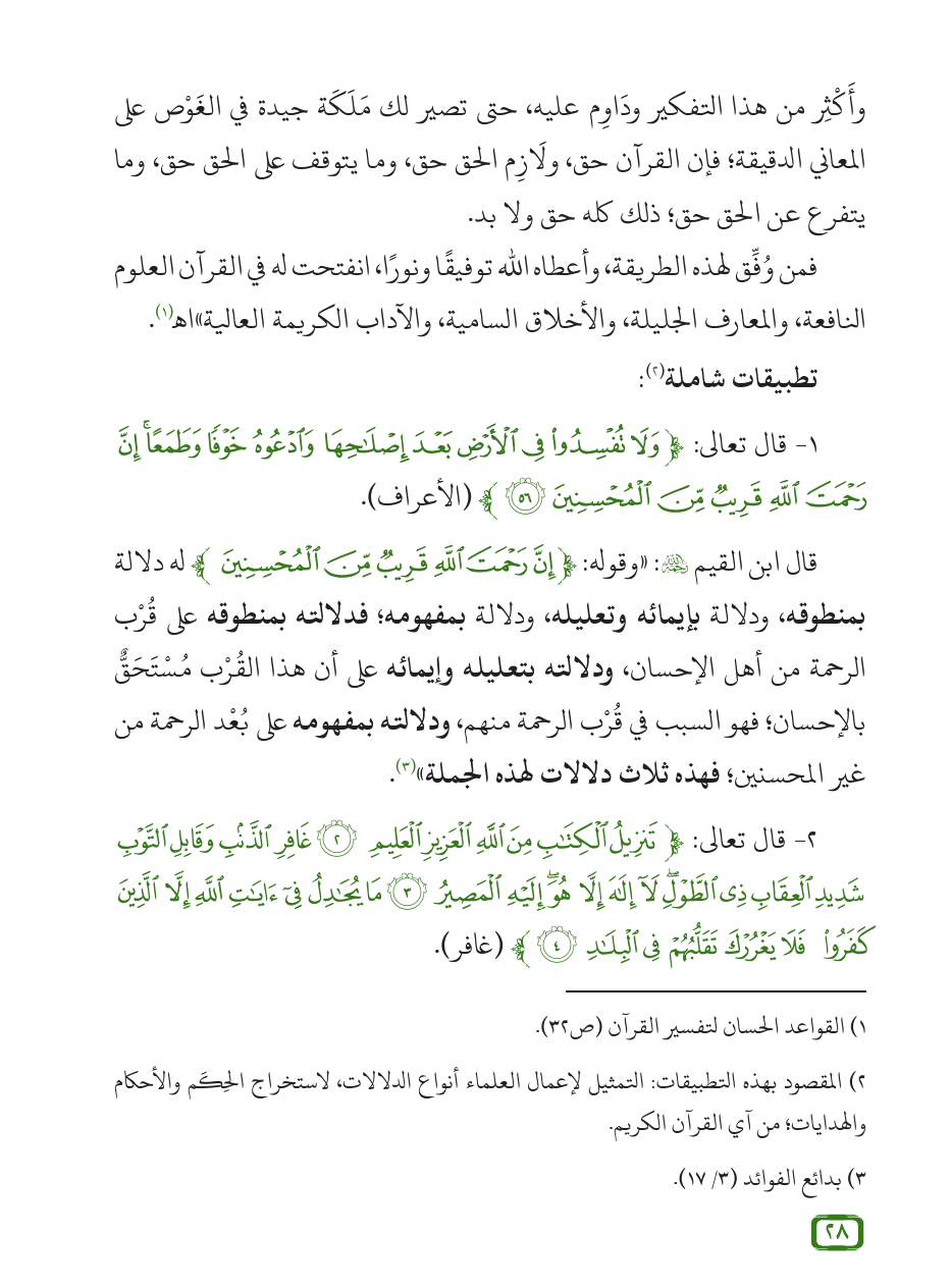 (¬2) المقصود بهذه التطبيقات: التمثيل لإعمال العلماء أنواع الدلالات، لاستخراج الحِكَم والأحكام والهدايات؛ من آي القرآن الكريم.