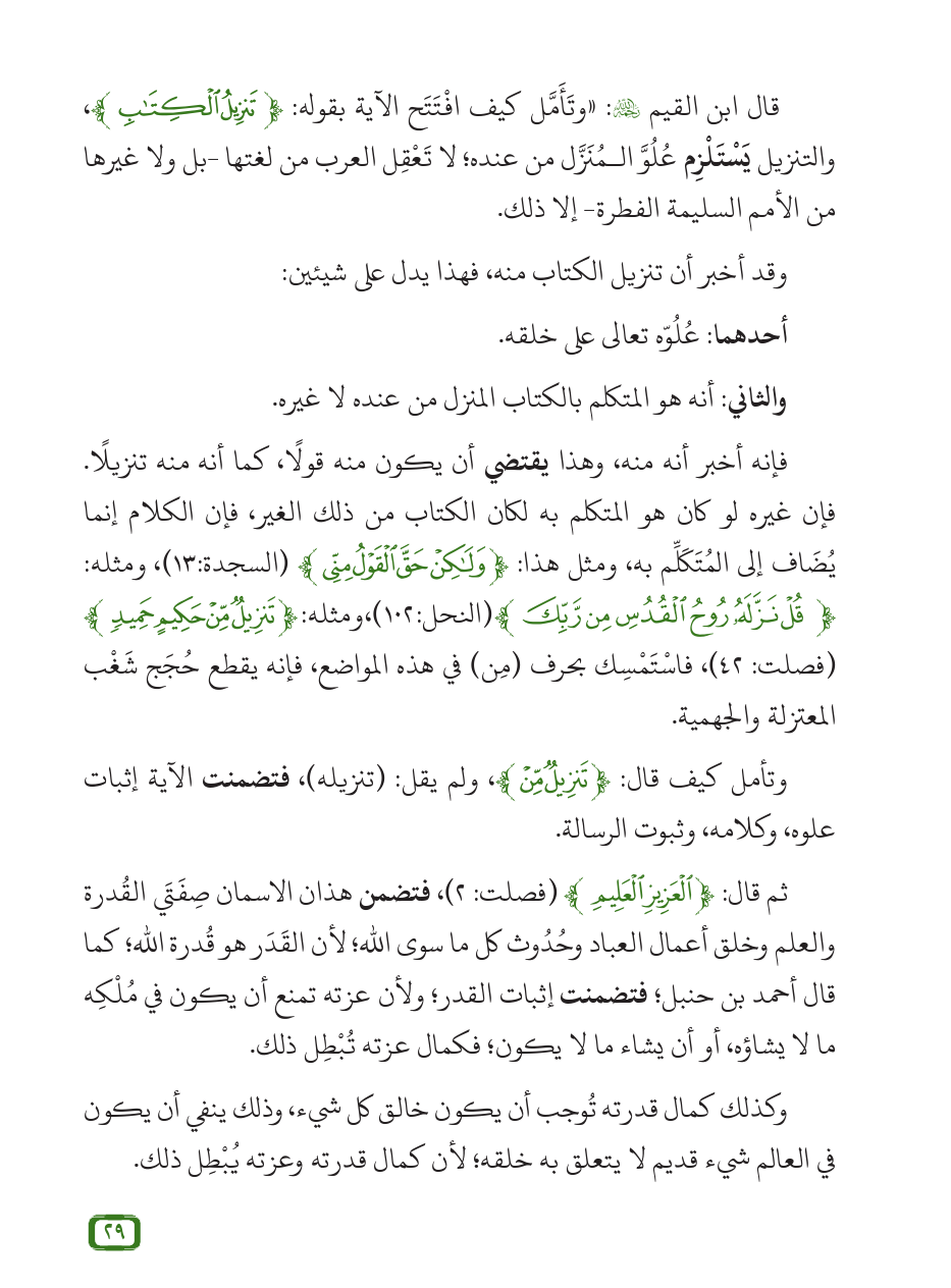 قال ابن القيم - رحمه الله -: «وتَأَمَّل كيف افْتَتَح الآية بقوله: {تَنْزِيلُ الْكِتَابِ}، والتنزيل يَسْتَلْزِم عُلُوَّ المُنَزَّل من عنده؛ لا تَعْقِل العرب من لغتها -بل ولا غيرها من الأمم السليمة الفطرة- إلا ذلك.