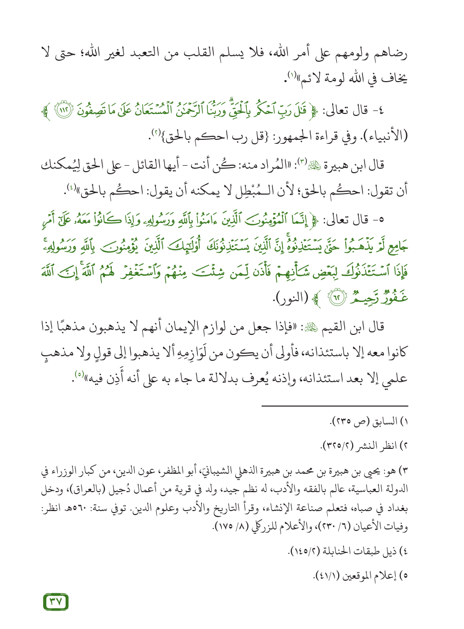 قال ابن القيم - رحمه الله -: «فإذا جعل من لوازم الإيمان أنهم لا يذهبون مذهبًا إذا كانوا معه إلا باستئذانه، فأولى أن يكون من لَوَازِمِهِ ألا يذهبوا إلى قولٍ ولا مذهبٍ علمي إلا بعد استئذانه، وإذنه يُعرف بدلالة ما جاء به على أنه أَذِن فيه» (¬5).