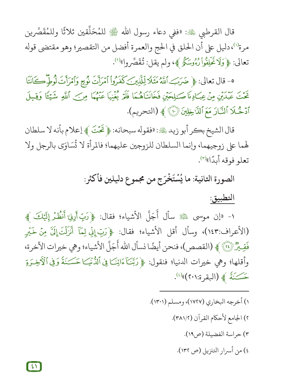 1 - «إن موسى - عليه السلام - سأل أَجَلَّ الأشياء؛ فقال: {رَبِّ أَرِنِي أَنْظُرْ إِلَيْكَ} (الأعراف: 143)، وسأل أقل الأشياء؛ فقال: {رَبِّ إِنِّي لِمَا أَنْزَلْتَ إِلَيَّ مِنْ خَيْرٍ فَقِيرٌ (24)} (القصص)، فنحن أيضًا نسأل الله أَجَلَّ الأشياء؛ وهي خيرات الآخرة، وأقلها؛ وهي خيرات الدنيا؛ فنقول: {رَبَّنَا آتِنَا فِي الدُّنْيَا حَسَنَةً وَفِي الْآخِرَةِ حَسَنَةً} (البقرة: 201)» (¬4).
