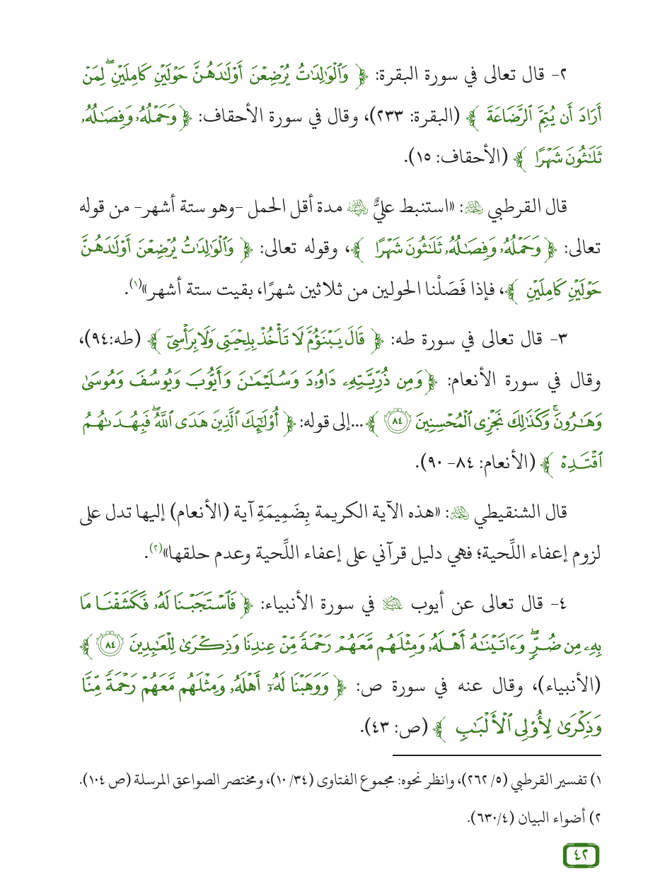 قال الشنقيطي - رحمه الله -: «هذه الآية الكريمة بِضَمِيمَةِ آية (الأنعام) إليها تدل على لزوم إعفاء اللِّحية؛ فهي دليل قرآني على إعفاء اللِّحية وعدم حلقها» (¬2).