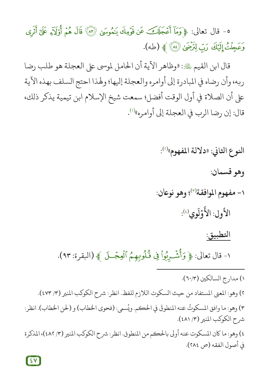 قال ابن القيم - رحمه الله -: «وظاهر الآية أن الحامل لموسى على العجلة هو طلب رضا ربه، وأن رضاه في المبادرة إلى أوامره والعجلة إليها؛ ولهذا احتج السلف بهذه الآية على أن الصلاة في أول الوقت أفضل؛ سمعت شيخ الإسلام ابن تيمية يذكر ذلك، قال: إن رضا الرب في العجلة إلى أوامره» (¬1).