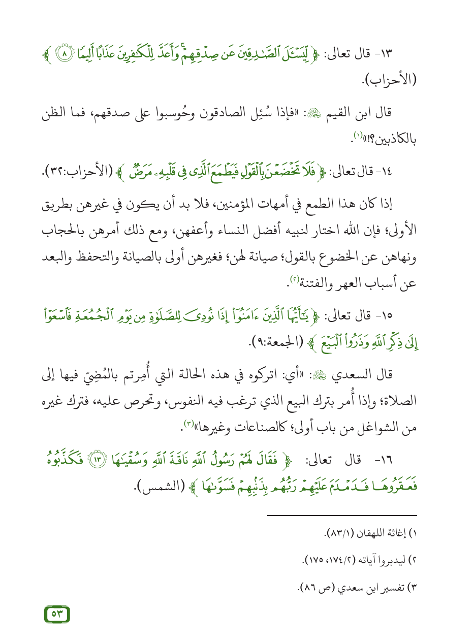13 - قال تعالى: {لِيَسْأَلَ الصَّادِقِينَ عَنْ صِدْقِهِمْ وَأَعَدَّ لِلْكَافِرِينَ عَذَابًا أَلِيمًا (8)} (الأحزاب).