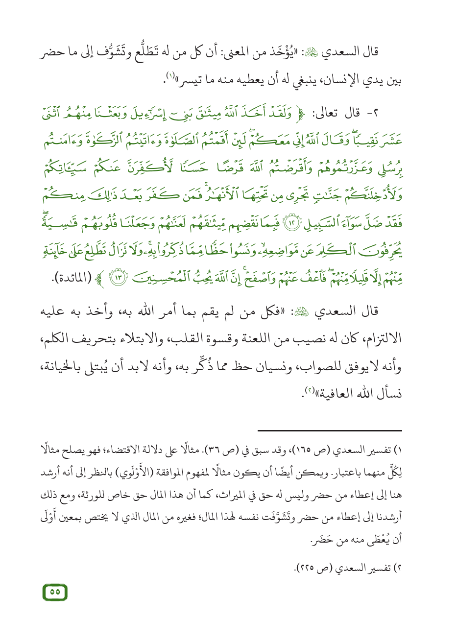 (¬1) تفسير السعدي (ص 165)، وقد سبق في (ص 36). مثالًا على دلالة الاقتضاء؛ فهو يصلح مثالًا لِكُلٍّ منهما باعتبار. ويمكن أيضًا أن يكون مثالًا لمفهوم الموافقة (الأَوْلَوي) بالنظر إلى أنه أرشد هنا إلى إعطاء من حضر وليس له حق في الميراث، كما أن هذا المال حق خاص للورثة، ومع ذلك أرشدنا إلى إعطاء من حضر وتَشَوَّفَت نفسه لهذا المال؛ فغيره من المال الذي لا يختص بمعين أَوْلَى أن يُعْطَى منه من حَضَر.