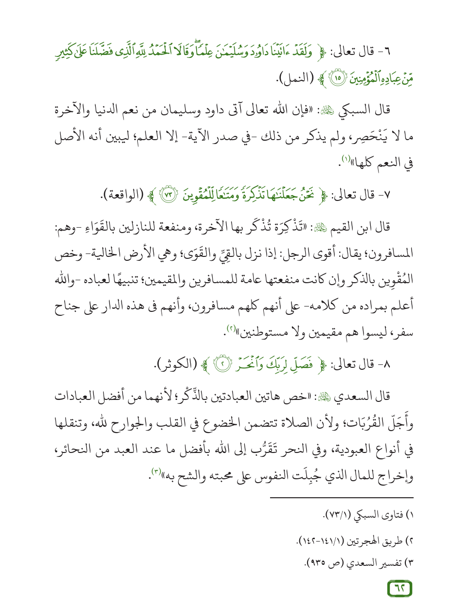 6 - قال تعالى: {وَلَقَدْ آتَيْنَا دَاوُودَ وَسُلَيْمَانَ عِلْمًا وَقَالَا الْحَمْدُ لِلَّهِ الَّذِي فَضَّلَنَا عَلَى كَثِيرٍ مِنْ عِبَادِهِ الْمُؤْمِنِينَ (15)} (النمل).