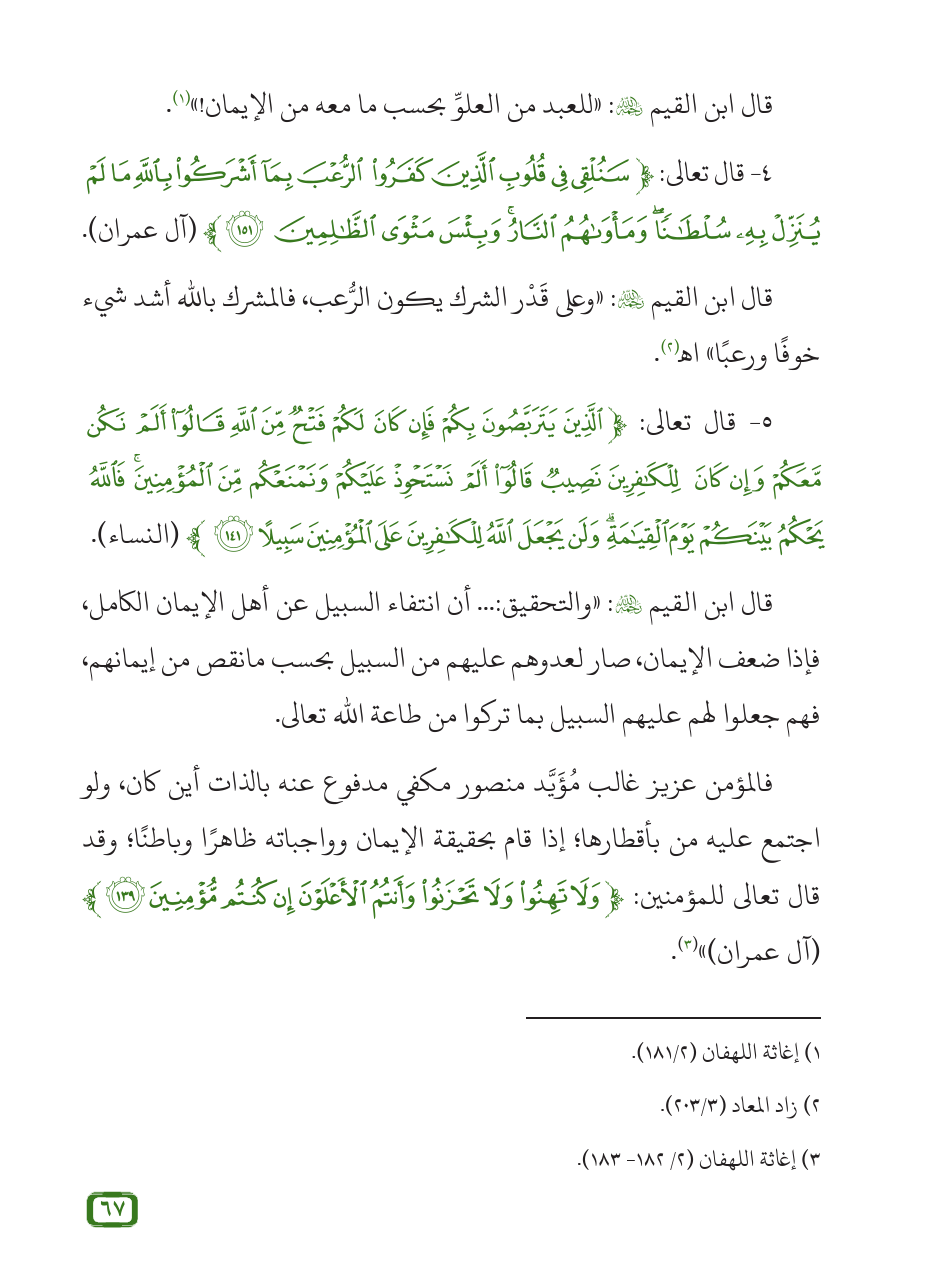 فالمؤمن عزيز غالب مُؤَيَّد منصور مكفي مدفوع عنه بالذات أين كان، ولو اجتمع عليه من بأقطارها؛ إذا قام بحقيقة الإيمان وواجباته ظاهرًا وباطنًا؛ وقد قال تعالى للمؤمنين: {وَلَا تَهِنُوا وَلَا تَحْزَنُوا وَأَنْتُمُ الْأَعْلَوْنَ إِنْ كُنْتُمْ مُؤْمِنِينَ (139)} (آل عمران)» (¬3).