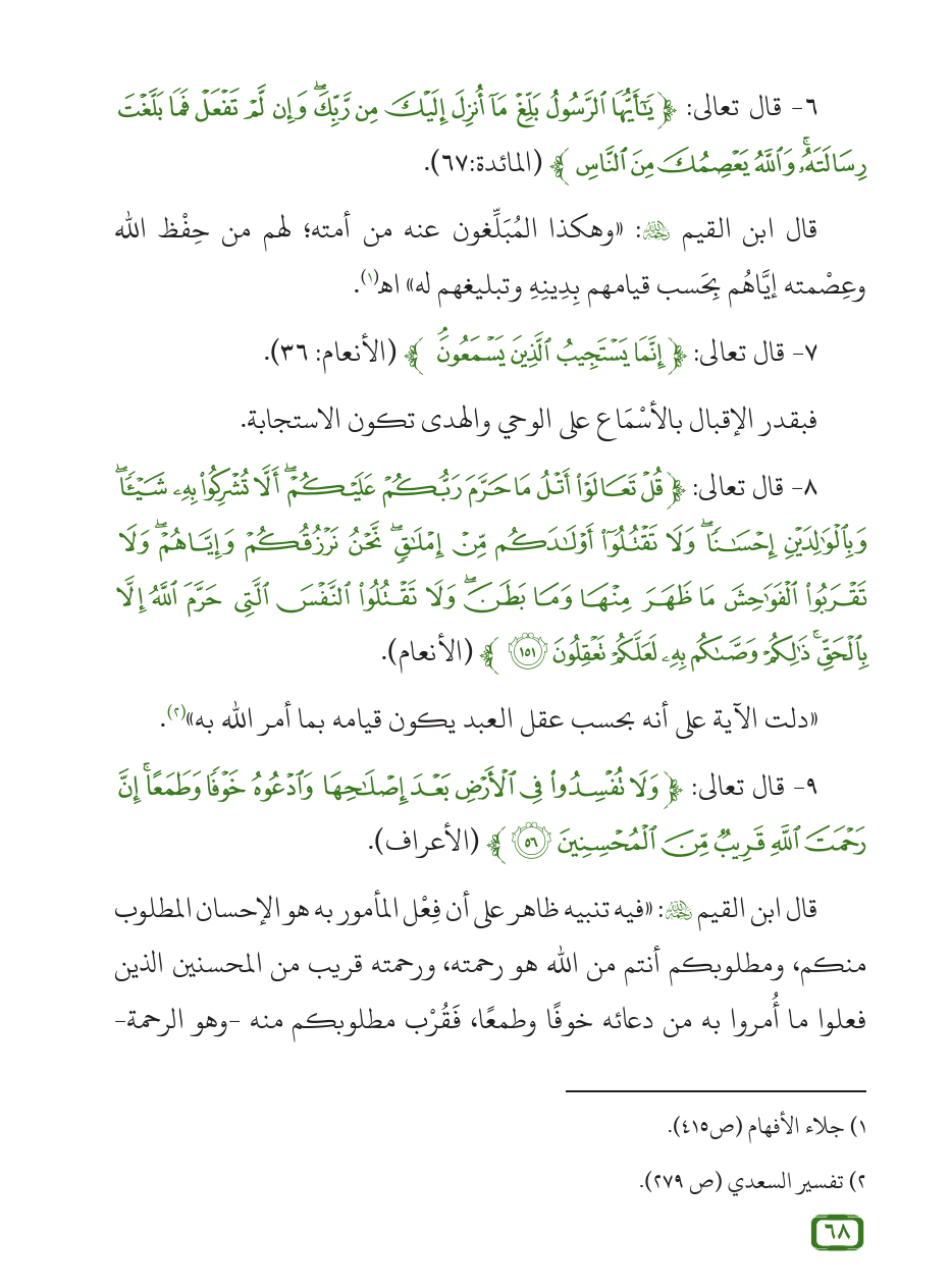 قال ابن القيم - رحمه الله -: «وهكذا المُبَلِّغون عنه من أمته؛ لهم من حِفْظ الله وعِصْمته إيَّاهُم بِحَسب قيامهم بِدِينِهِ وتبليغهم له» اهـ (¬1).
