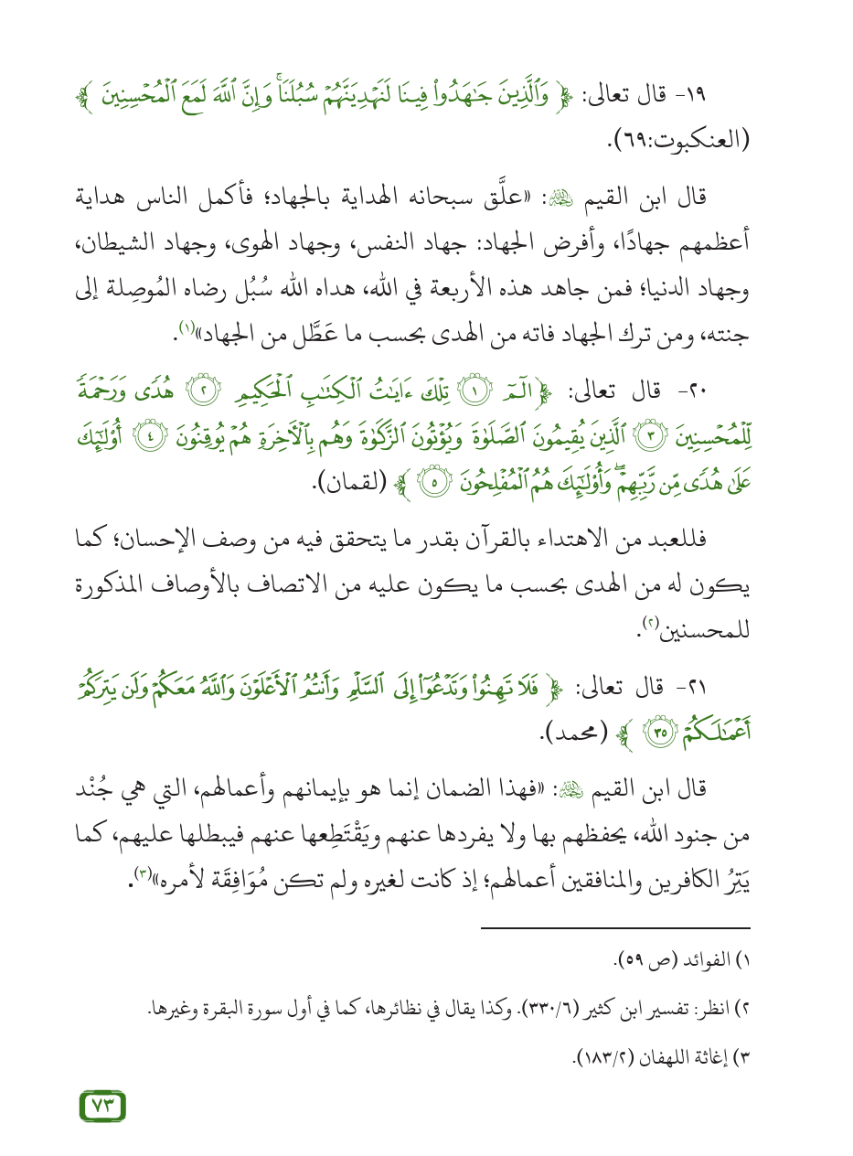 فللعبد من الاهتداء بالقرآن بقدر ما يتحقق فيه من وصف الإحسان؛ كما يكون له من الهدى بحسب ما يكون عليه من الاتصاف بالأوصاف المذكورة للمحسنين (¬2).