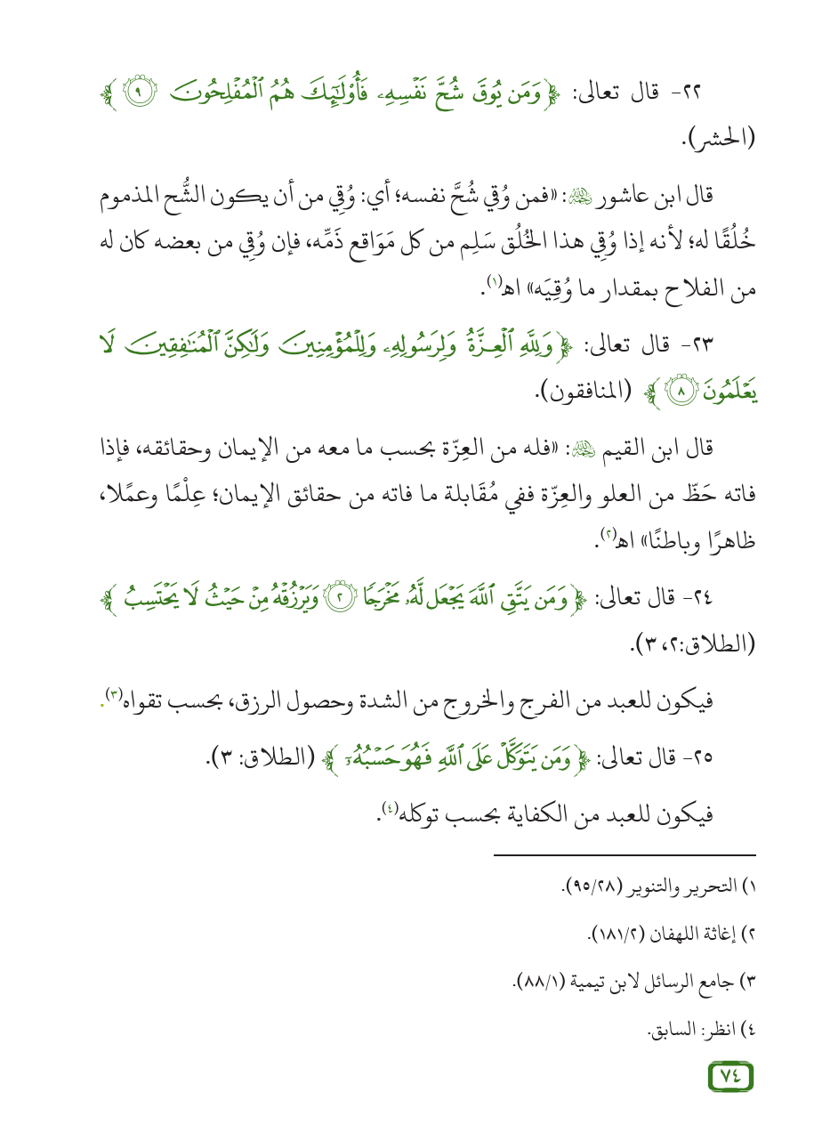قال ابن القيم - رحمه الله -: «فله من العِزّة بحسب ما معه من الإيمان وحقائقه، فإذا فاته حَظّ من العلو والعِزّة ففي مُقَابلة ما فاته من حقائق الإيمان؛ عِلْمًا وعملًا، ظاهرًا وباطنًا» اهـ (¬2).