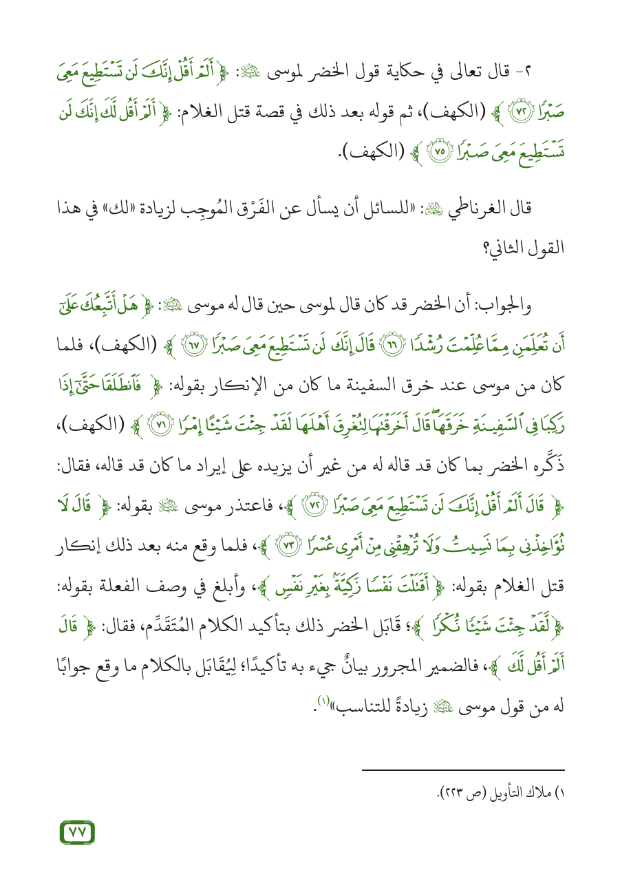 والجواب: أن الخضر قد كان قال لموسى حين قال له موسى - عليه السلام -: {هَلْ أَتَّبِعُكَ عَلَى أَنْ تُعَلِّمَنِ مِمَّا عُلِّمْتَ رُشْدًا (66) قَالَ إِنَّكَ لَنْ تَسْتَطِيعَ مَعِيَ صَبْرًا (67)} (الكهف)، فلما كان من موسى عند خرق السفينة ما كان من الإنكار بقوله: {فَانْطَلَقَا حَتَّى إِذَا رَكِبَا فِي السَّفِينَةِ خَرَقَهَا قَالَ أَخَرَقْتَهَا لِتُغْرِقَ أَهْلَهَا لَقَدْ جِئْتَ شَيْئًا إِمْرًا (71)} (الكهف)، ذَكَّره الخضر بما كان قد قاله له من غير أن يزيده على إيراد ما كان قد قاله، فقال: {قَالَ أَلَمْ أَقُلْ إِنَّكَ لَنْ تَسْتَطِيعَ مَعِيَ صَبْرًا (72)}، فاعتذر موسى - عليه السلام - بقوله: {قَالَ لَا تُؤَاخِذْنِي بِمَا نَسِيتُ وَلَا تُرْهِقْنِي مِنْ أَمْرِي عُسْرًا (73)}، فلما وقع منه بعد ذلك إنكار قتل الغلام بقوله: {أَقَتَلْتَ نَفْسًا زَكِيَّةً بِغَيْرِ نَفْسٍ}، وأبلغ في وصف الفعلة بقوله: {لَقَدْ جِئْتَ شَيْئًا نُكْرًا}؛ قَابَل الخضر ذلك بتأكيد الكلام المُتَقَدِّم، فقال: {قَالَ أَلَمْ أَقُلْ لَكَ}، فالضمير المجرور بيانٌ جيء به تأكيدًا؛ لِيُقَابَل بالكلام ما وقع جوابًا له من قول موسى - عليه السلام - زيادةً للتناسب» (¬1).
