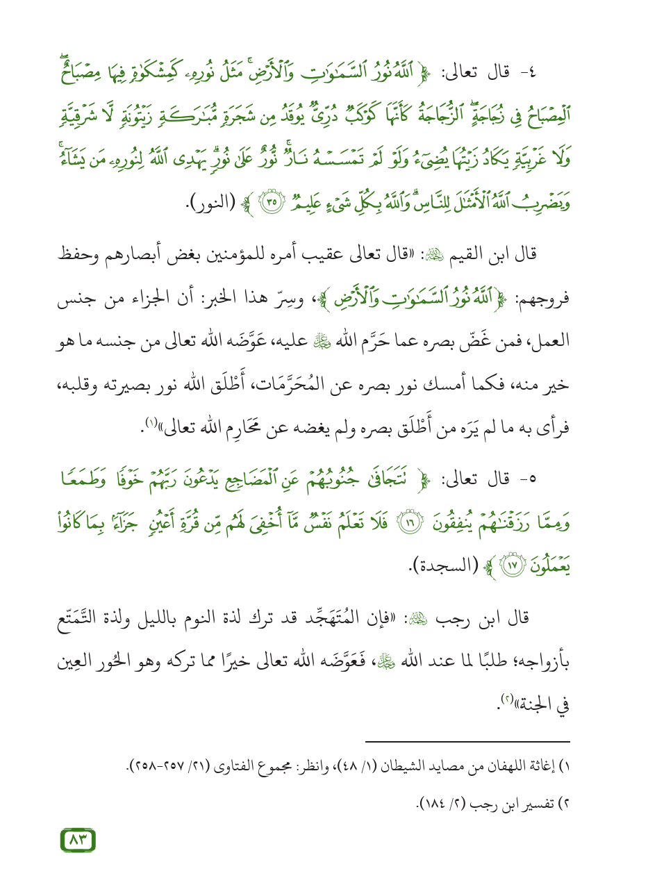 قال ابن القيم - رحمه الله -: «قال تعالى عقيب أمره للمؤمنين بغض أبصارهم وحفظ فروجهم: {اللَّهُ نُورُ السَّمَاوَاتِ وَالْأَرْضِ}، وسِرّ هذا الخبر: أن الجزاء من جنس العمل، فمن غَضّ بصره عما حَرَّم الله - عز وجل - عليه، عَوَّضَه الله تعالى من جنسه ما هو خير منه، فكما أمسك نور بصره عن المُحَرَّمَات، أَطْلَق الله نور بصيرته وقلبه، فرأى به ما لم يَرَه من أَطْلَق بصره ولم يغضه عن مَحَارِم الله تعالى» (¬1).