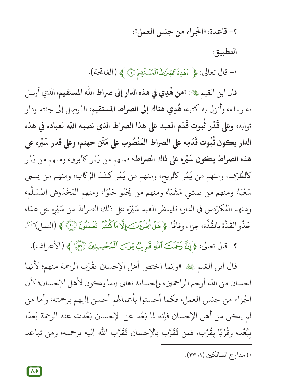 قال ابن القيم - رحمه الله -: «من هُدِي في هذه الدار إلى صراط الله المستقيم، الذي أرسل به رسله، وأنزل به كتبه، هُدِي هناك إلى الصراط المستقيم، المُوصِل إلى جنته ودار ثوابه، وعلى قَدْر ثُبوت قَدَم العبد على هذا الصراط الذي نصبه الله لعباده في هذه الدار يكون ثُبُوت قَدَمِه على الصراط المَنْصُوب على مَتْن جهنم، وعلى قدر سَيْره على هذه الصراط يكون سَيْره على ذاك الصراط؛ فمنهم من يَمُر كالبرق، ومنهم من يَمُر كالطَّرْف، ومنهم من يَمُر كالريح، ومنهم من يَمُر كشَدّ الرِّكَاب، ومنهم من يسعى سَعْيَا، ومنهم من يمشي مَشْيَا، ومنهم من يَحْبُو حَبْوَا، ومنهم المَخْدُوش المُسَلَّم، ومنهم المُكَرْدس في النار، فلينظر العبد سَيْرَه على ذلك الصراط من سَيْرِه على هذا، حَذْو القُذَّة بالقُذَّة، جزاء وفاقًا: {هَلْ تُجْزَوْنَ إِلَّا مَا كُنْتُمْ تَعْمَلُونَ (90)} (النمل)» (¬1).