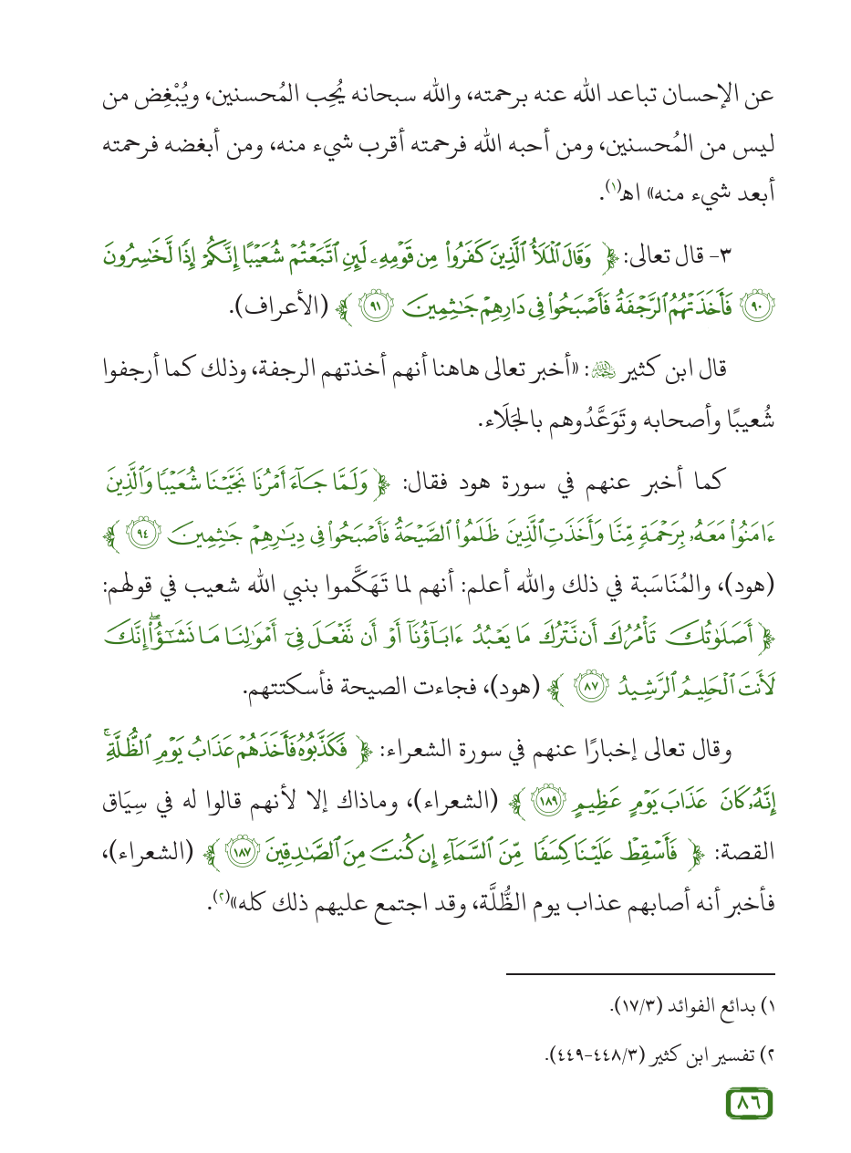 وقال تعالى إخبارًا عنهم في سورة الشعراء: {فَكَذَّبُوهُ فَأَخَذَهُمْ عَذَابُ يَوْمِ الظُّلَّةِ إِنَّهُ كَانَ عَذَابَ يَوْمٍ عَظِيمٍ (189)} (الشعراء)، وماذاك إلا لأنهم قالوا له في سِيَاق القصة: {فَأَسْقِطْ عَلَيْنَا كِسَفًا مِنَ السَّمَاءِ إِنْ كُنْتَ مِنَ الصَّادِقِينَ (187)} (الشعراء)، فأخبر أنه أصابهم عذاب يوم الظُّلَّة، وقد اجتمع عليهم ذلك كله» (¬2).