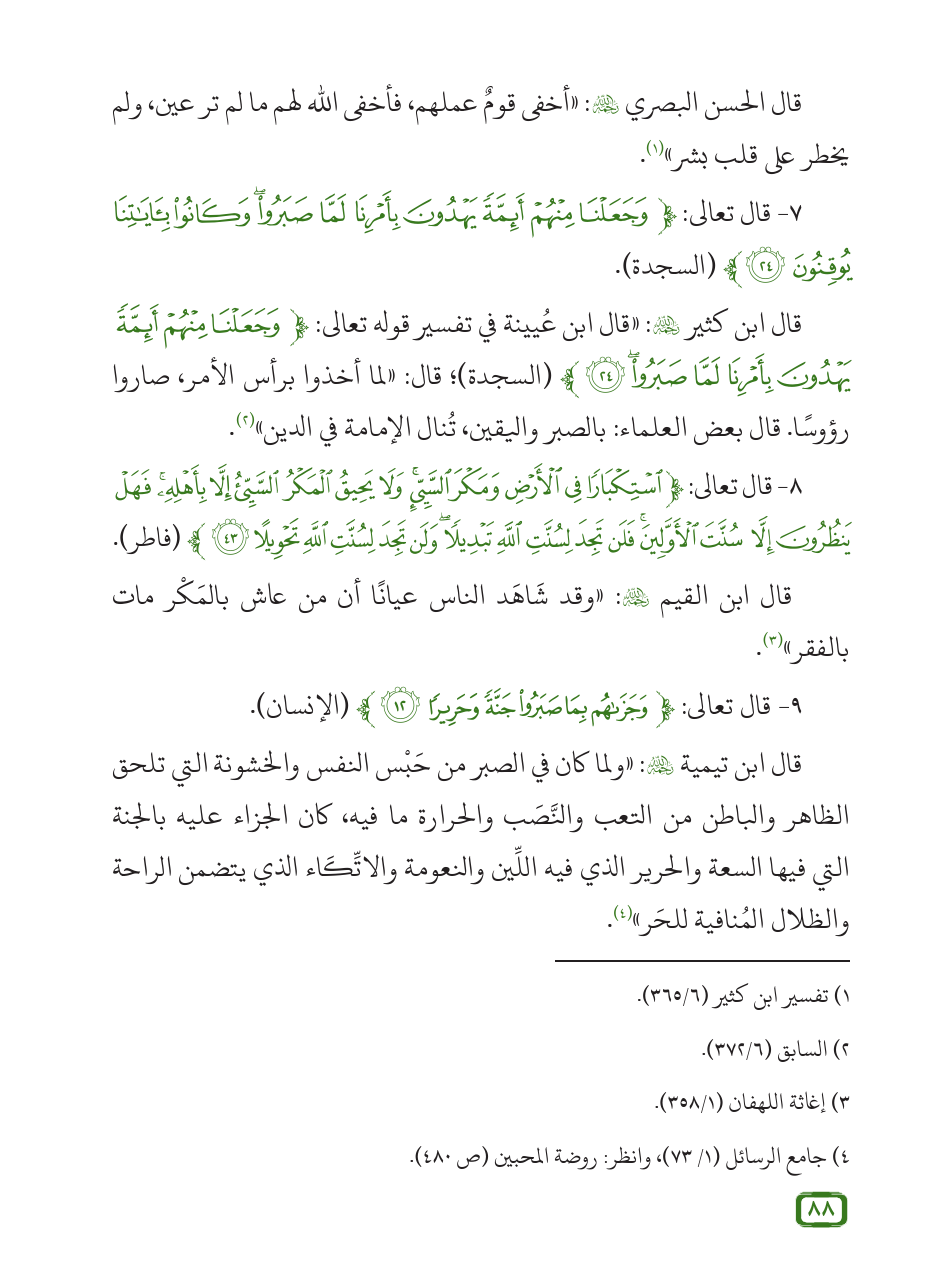 قال ابن كثير - رحمه الله -: «قال ابن عُيينة في تفسير قوله تعالى: {وَجَعَلْنَا مِنْهُمْ أَئِمَّةً يَهْدُونَ بِأَمْرِنَا لَمَّا صَبَرُوا (24)} (السجدة)؛ قال: «لما أخذوا برأس الأمر، صاروا رؤوسًا. قال بعض العلماء: بالصبر واليقين، تُنال الإمامة في الدين» (¬2).
