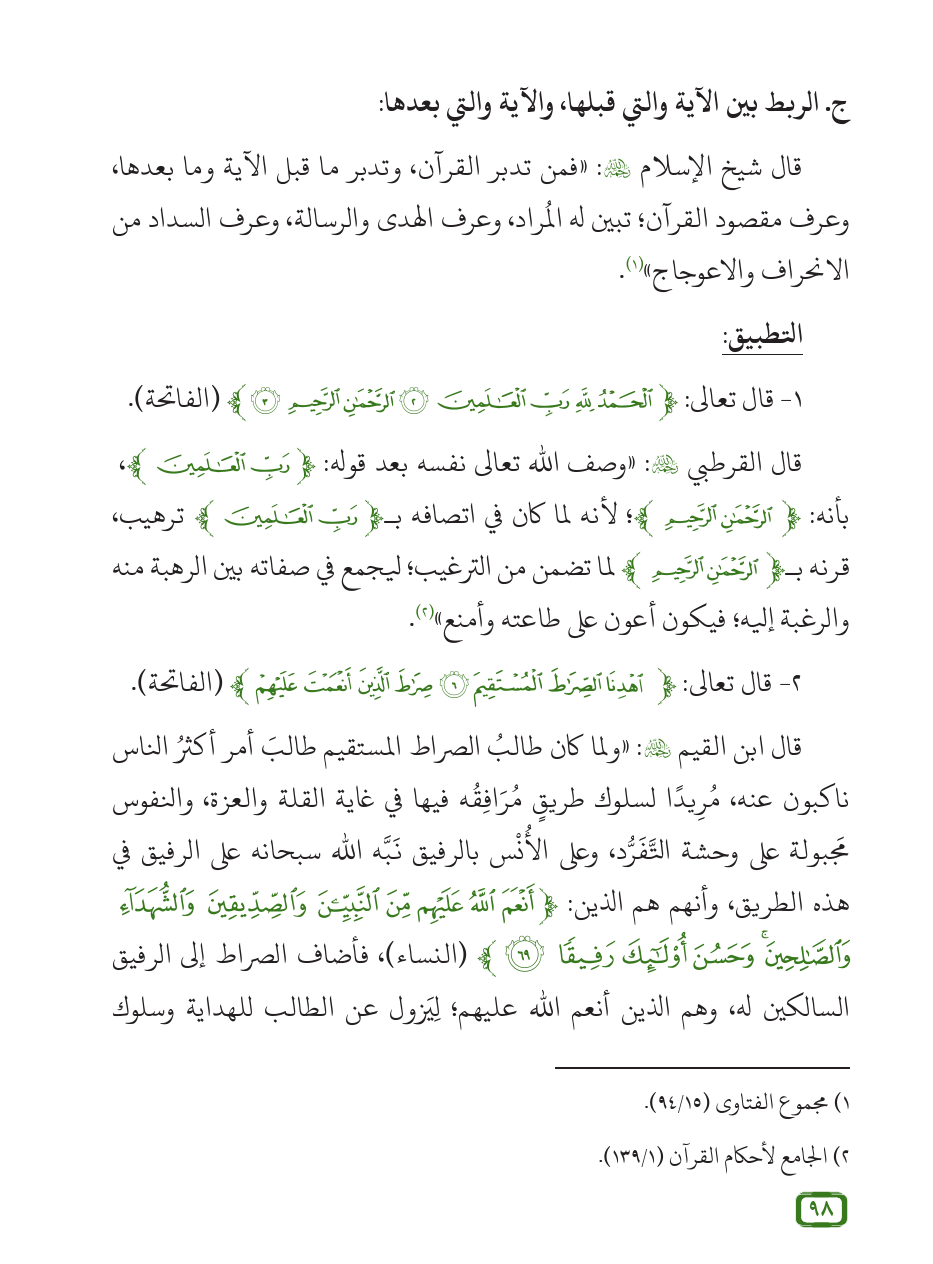 1 - قال تعالى: {الْحَمْدُ لِلَّهِ رَبِّ الْعَالَمِينَ (2) الرَّحْمَنِ الرَّحِيمِ (3)} (الفاتحة). قال القرطبي - رحمه الله -: «وصف الله تعالى نفسه بعد قوله: {رَبِّ الْعَالَمِينَ}، بأنه: {الرَّحْمَنِ الرَّحِيمِ}؛ لأنه لما كان في اتصافه بـ {رَبِّ الْعَالَمِينَ} ترهيب، قرنه بـ {الرَّحْمَنِ الرَّحِيمِ} لما تضمن من الترغيب؛ ليجمع في صفاته بين الرهبة منه والرغبة إليه؛ فيكون أعون على طاعته وأمنع» (¬2).