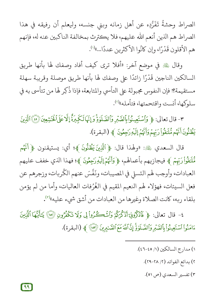قال السعدي - رحمه الله -: «ولهذا قال: {الَّذِينَ يَظُنُّونَ}؛ أي: يستيقنون {أَنَّهُمْ مُلَاقُو رَبِّهِمْ} فيجازيهم بأعمالهم، {وَأَنَّهُمْ إِلَيْهِ رَاجِعُونَ}؛ فهذا الذي خفف عليهم العبادات، وأوجب لهم التسلي في المصيبات، ونَفَّسَ عنهم الكُربات، وزجرهم عن فعل السيئات، فهؤلاء لهم النعيم المقيم في الغُرُفات العاليات، وأما من لم يؤمن بلقاء ربه، كانت الصلاة وغيرها من العبادات من أشق شيء عليه» (¬3).