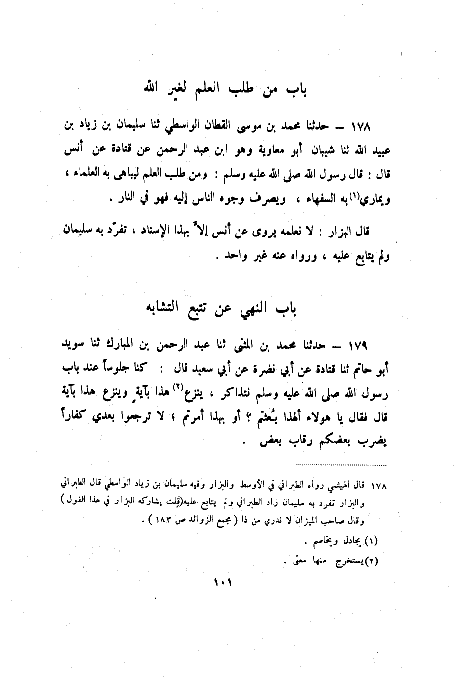 178 - حَدَّثَنَا مُحَمَّدُ بْنُ مُوسَى الْقَطَّانُ الْوَاسِطِيُّ، ثنا سُلَيْمَانُ بْنُ زِيَادِ بْنِ عُبَيْدِ اللَّهِ، ثنا شَيْبَانُ أَبُو مُعَاوِيَةَ، وَهُوَ ابْنُ عَبْدِ الرَّحْمَنِ، عَنْ قَتَادَةَ، عَنْ أَنَسٍ، قَالَ: قَالَ رَسُولُ اللَّهِ صَلَّى اللَّهُ عَلَيْهِ وَسَلَّمَ: «وَمَنْ طَلَبَ الْعِلْمَ لِيُبَاهِيَ بِهِ الْعُلَمَاءَ، وَيُمَارِيَ بِهِ السُّفَهَاءَ، وَيَصْرِفَ وُجُوهَ النَّاسِ إِلَيْهِ فَهُوَ فِي النَّارِ» .