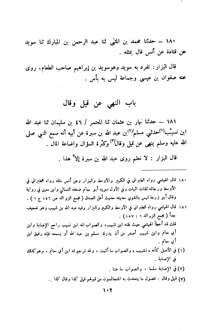 181 - حَدَّثَنَا نَهَارُ بْنُ عُثْمَانَ، ثنا الْمُعْتَمِرُ بْنُ سُلَيْمَانَ، ثنا عَبْدُ اللَّهِ بْنُ نَسِيبٍ، حَدَّثَنِي مُسْلِمُ بْنُ عَبْدِ اللَّهِ بْنِ سَبْرَةَ، عَنْ أَبِيهِ، أَنَّهُ سَمِعَ النَّبِيَّ صَلَّى اللَّهُ عَلَيْهِ وَسَلَّمَ يَنْهَى عَنْ قِيلَ وَقَالَ، وَكَثْرَةِ السُّؤَالِ، وَإِضَاعَةِ الْمَالِ.