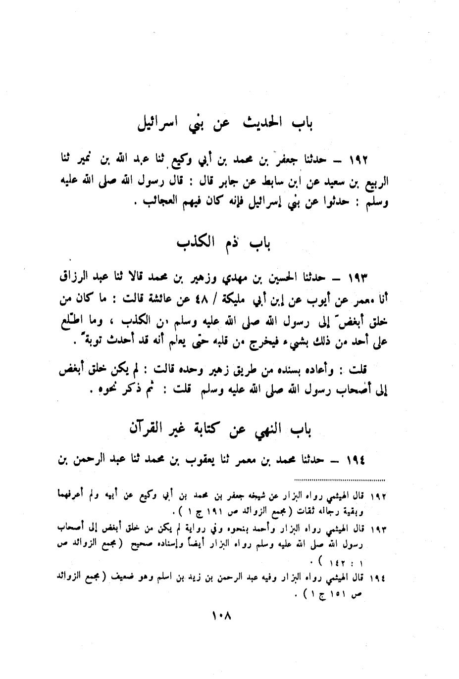 192 - حَدَّثَنَا جَعْفَرُ بْنُ مُحَمَّدِ بْنِ أَبِي وَكِيعٍ، ثنا عَبْدُ اللَّهِ بْنُ نُمَيْرٍ، ثنا الرَّبِيعُ بْنُ سَعِيدٍ، عَنِ ابْنِ سَابِطٍ، عَنْ جَابِرٍ، قَالَ: قَالَ رَسُولُ اللَّهِ صَلَّى اللَّهُ عَلَيْهِ وَسَلَّمَ: «حَدِّثُوا عَنْ بَنِي إِسْرَائِيلَ فَإِنَّهُ كَانَ فِيهِمُ الْعَجَائِبُ» .