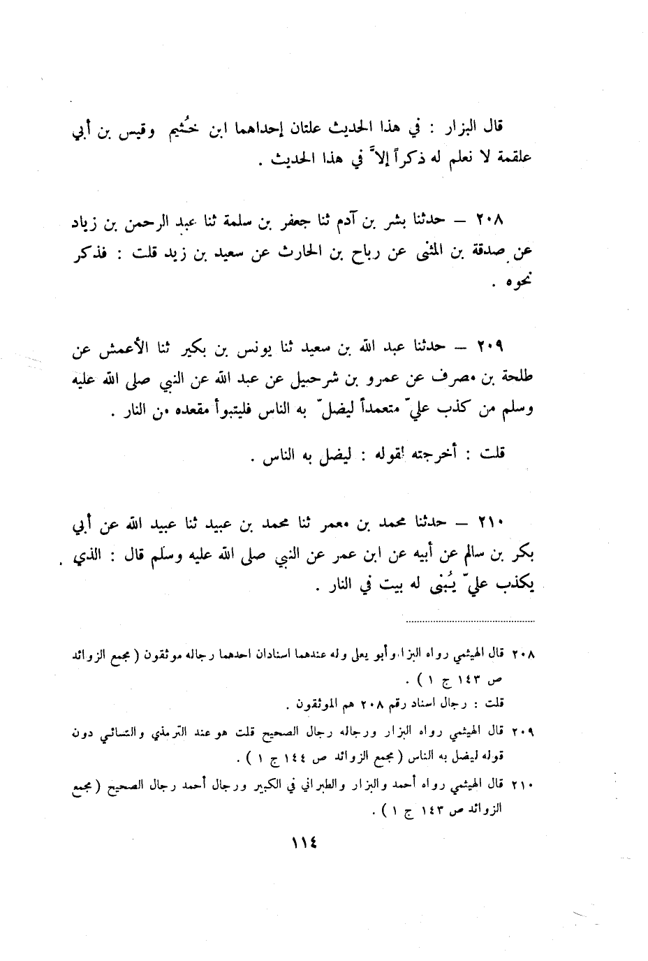 209 - حَدَّثَنَا عَبْدُ اللَّهِ بْنُ سَعِيدٍ، ثنا يُونُسُ بْنُ بُكَيْرٍ، ثنا الأَعْمَشُ، عَنْ طَلْحَةَ بْنِ مُصَرِّفٍ، عَنْ عَمْرِو بْنِ شُرَحْبِيلَ، عَنْ عَبْدِ اللَّهِ، عَنِ النَّبِيِّ صَلَّى اللَّهُ عَلَيْهِ وَسَلَّمَ: «مَنْ كَذَبَ عَلَيَّ مُتَعَمِّدًا لِيُضِلَّ بِهِ النَّاسَ فَلْيَتَبَوَّأْ مَقْعَدَهُ مِنَ النَّارِ» .