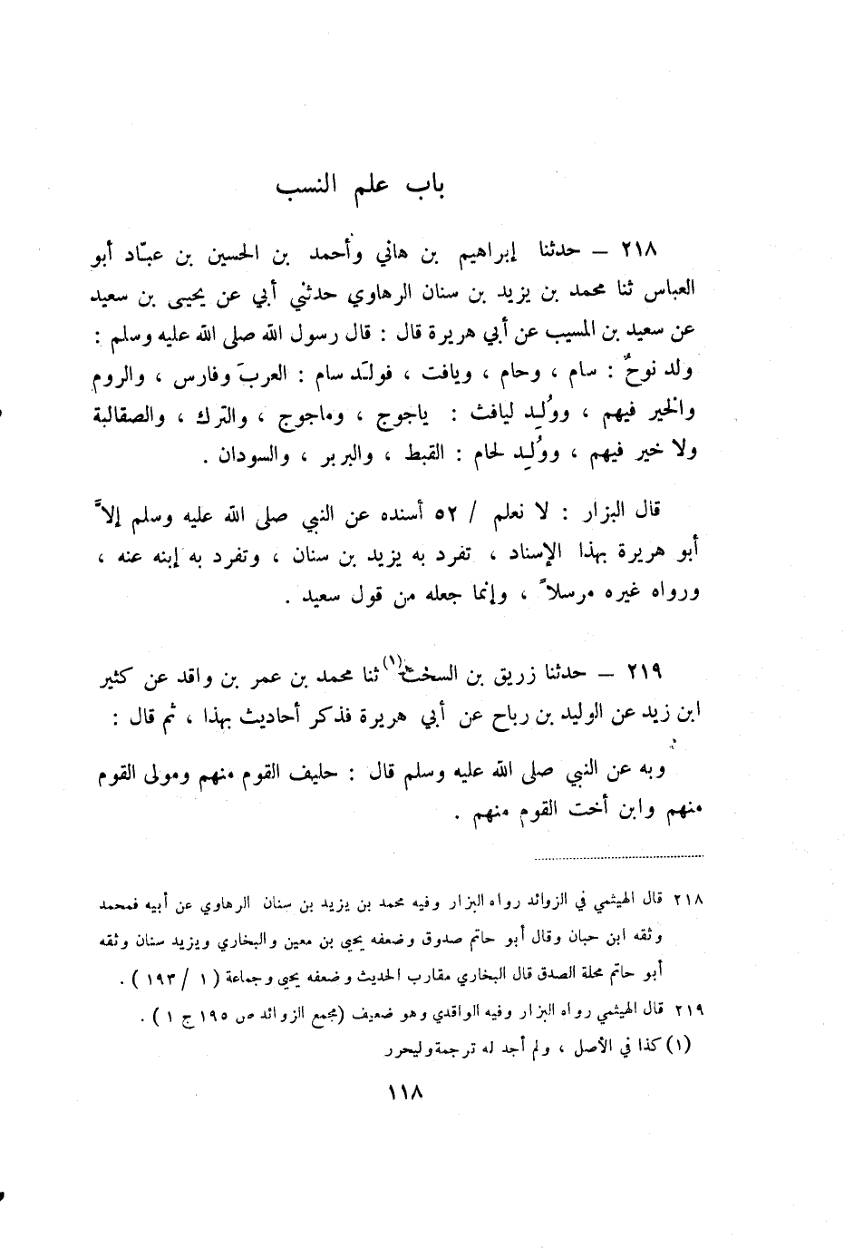 218 - حَدَّثَنَا إِبْرَاهِيمُ بْنُ هَانِئٍ، وَأَحْمَدُ بْنُ الْحُسَيْنِ بْنِ عَبَّادٍ أَبُو الْعَبَّاسِ، ثنا مُحَمَّدُ بْنُ يَزِيدَ بْنِ سِنَانٍ الرَّهَاوِيُّ، حَدَّثَنِي أَبِي، عَنْ يَحْيَى بْنِ سَعِيدٍ، عَنْ سَعِيدِ بْنِ الْمُسَيِّبِ، عَنْ أَبِي هُرَيْرَةَ، قَالَ: قَالَ رَسُولُ اللَّهِ صَلَّى اللَّهُ عَلَيْهِ وَسَلَّمَ: " وَلَدُ نُوحٍ: سَامٌ، وَحَامٌ، وَيَافِثُ، فَوَلَدُ سَامٍ: الْعَرَبُ وَفَارِسُ، وَالرُّومُ، وَالْخَيْرُ فِيهِمْ، وَوُلِدَ لِيَافِثَ: يَأْجُوجُ، وَمَأْجُوجُ، وَالتُّرْكُ، وَالصَّقَالِبَةُ، وَلا خَيْرَ فِيهِمْ، وَوُلِدَ لِحَامٍ: الْقِبْطُ، وَالْبَرْبَرُ، وَالسُّودَانُ ".