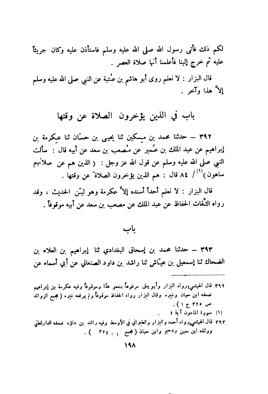 392 - حَدَّثَنَا مُحَمَّدُ بْنُ مِسْكِينٍ، ثنا يَحْيَى بْنُ حَسَّانَ، ثنا عِكْرِمَةُ بْنُ إِبْرَاهِيمَ، عَنْ عَبْدِ الْمَلِكِ بْنِ عُمَيْرٍ، عَنْ مُصْعَبِ بْنِ سَعْدٍ، عَنْ أَبِيهِ، قَالَ: سَأَلْتُ النَّبِيَّ صَلَّى اللَّهُ عَلَيْهِ وَسَلَّمَ عَنْ قَوْلِ اللَّهِ عَزَّ وَجَلَّ: {الَّذِينَ هُمْ عَنْ صَلاتِهِمْ سَاهُونَ} [الماعون: 5] ، قَالَ: «هُمُ الَّذِينَ يُؤَخِّرُونَ الصَّلاةَ عَنْ وَقْتِهَا» .