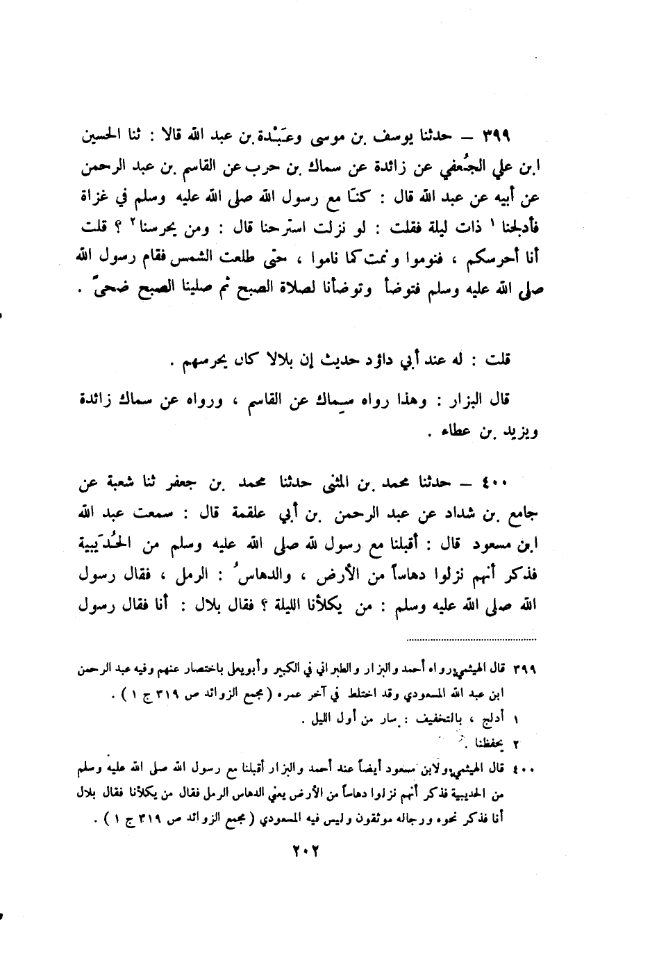 399 - حَدَّثَنَا يُوسُفُ بْنُ مُوسَى، وَعَبْدَةُ بْنُ عَبْدِ اللَّهِ، قَالا: ثنا الْحُسَيْنُ بْنُ عَلِيٍّ الْجُعْفِيُّ، عَنْ زَائِدَةَ، عَنْ سِمَاكِ بْنِ حَرْبٍ، عَنِ الْقَاسِمِ بْنِ عَبْدِ الرَّحْمَنِ، عَنْ أَبِيهِ، عَنْ عَبْدِ اللَّهِ، قَالَ: كُنَّا مَعَ رَسُولِ اللَّهِ صَلَّى اللَّهُ عَلَيْهِ وَسَلَّمَ فِي غَزَاةٍ، فَأَدْلَجْنَا ذَاتَ لَيْلَةٍ، فَقُلْتُ: لَوْ نَزَلْتَ اسْتَرَحْنَا، قَالَ: «وَمَنْ يَحْرُسُنَا؟» ، قُلْتُ: أَنَا أَحْرُسُكُمْ، فَنُوِّمُوا وَنِمْتُ كَمَا نَامُوا حَتَّى طَلَعَتِ الشَّمْسُ، فَقَامَ رَسُولُ اللَّهِ صَلَّى اللَّهُ عَلَيْهِ وَسَلَّمَ فَتَوَضَّأَ وَتَوَضَّأْنَا لِصَلاةِ الصُّبْحِ، ثُمَّ صَلَّيْنَا الصُّبْحَ ضُحًى.