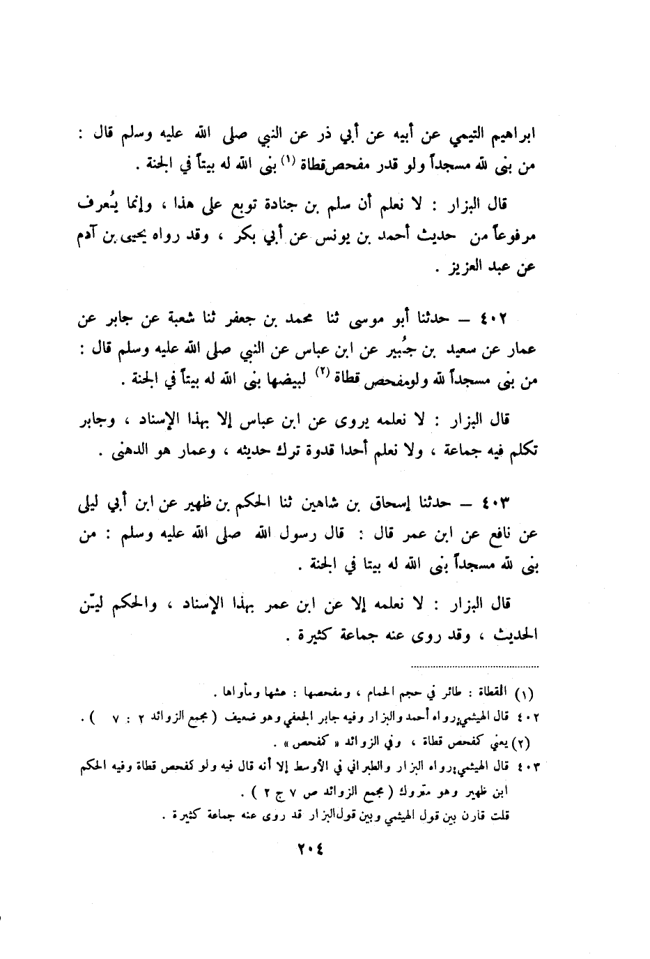 402 - حَدَّثَنَا أَبُو مُوسَى، ثنا مُحَمَّدُ بْنُ جَعْفَرٍ، ثنا شُعْبَةُ، عَنْ جَابِرٍ، عَنْ عَمَّارٍ، عَنْ سَعِيدِ بْنِ جُبَيْرٍ، عَنِ ابْنِ عَبَّاسٍ، عَنِ النَّبِيِّ صَلَّى اللَّهُ عَلَيْهِ وَسَلَّمَ، قَالَ: «مَنْ بَنَى مَسْجِدًا لِلَّهِ وَلَوْ مَفْحَصَ قَطَاةٍ لِبَيْضِهَا بَنَى اللَّهُ لَهُ بَيْتًا فِي الْجَنَّةِ» .