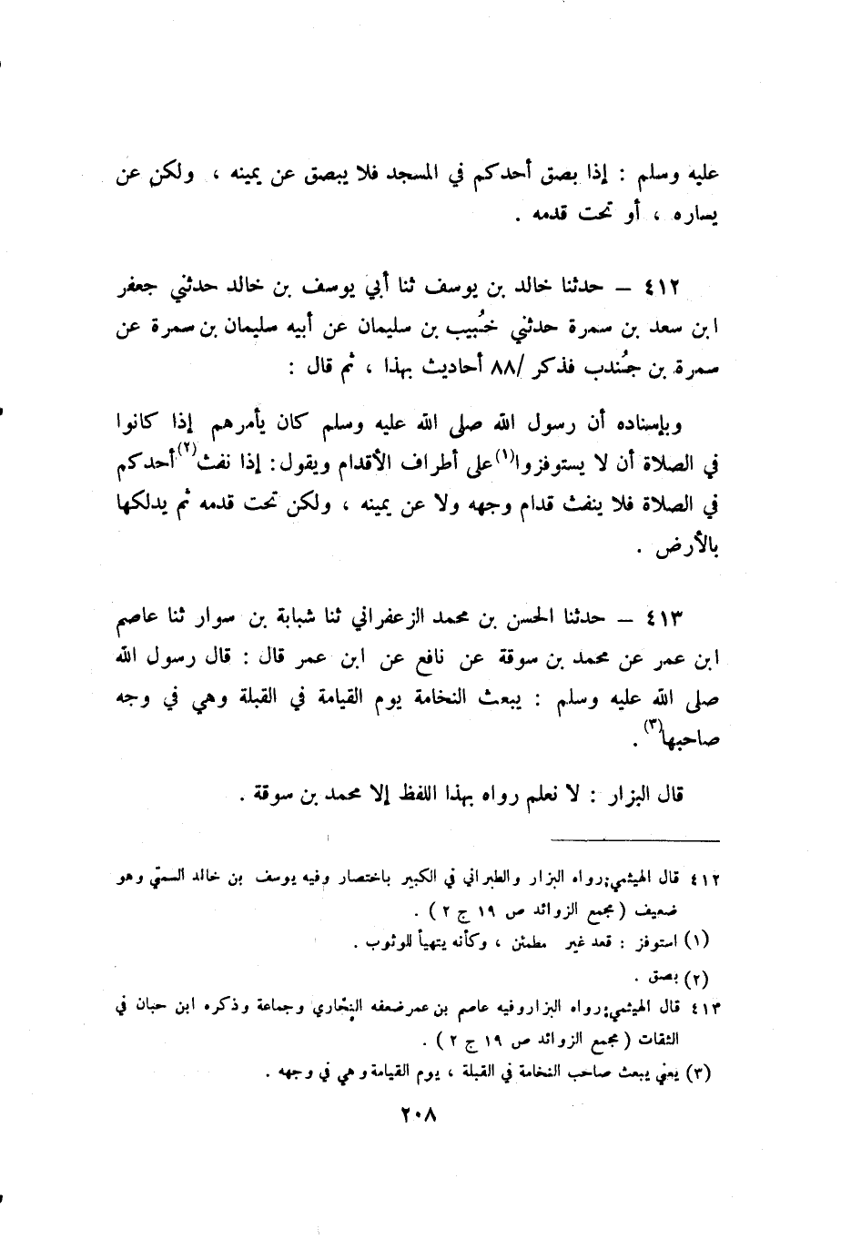 413 - حَدَّثَنَا الْحَسَنُ بْنُ مُحَمَّدٍ الزَّعْفَرَانِيُّ، ثنا شَبَابَةُ بْنُ سَوَّارٍ، ثنا عَاصِمُ بْنُ عُمَرَ، عَنْ مُحَمَّدِ بْنِ سُوقَةَ، عَنْ نَافِعٍ، عَنِ ابْنِ عُمَرَ، قَالَ: قَالَ رَسُولُ اللَّهِ صَلَّى اللَّهُ عَلَيْهِ وَسَلَّمَ: «تُبْعَثُ النُّخَامَةُ يَوْمَ الْقِيَامَةِ فِي الْقِبْلَةِ، وَهِيَ فِي وَجْهِ صَاحِبِهَا» .