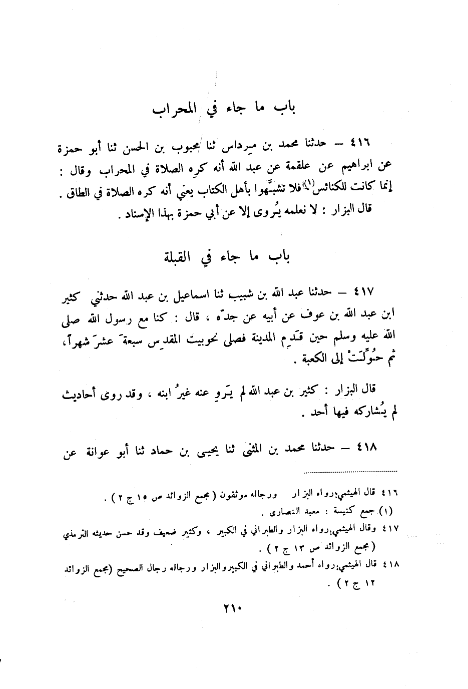 416 - حَدَّثَنَا مُحَمَّدُ بْنُ مِرْدَاسٍ، ثنا مَحْبُوبُ بْنُ الْحَسَنِ، ثنا أَبُو حَمْزَةَ، عَنْ إِبْرَاهِيمَ، عَنْ عَلْقَمَةَ، عَنْ عَبْدِ اللَّهِ، أَنَّهُ كَرِهَ الصَّلاةَ فِي الْمِحْرَابِ، وَقَالَ: إِنَّمَا كَانَتْ لِلْكَنَائِسِ، فَلا تَشَبَّهُوا بِأَهْلِ الْكِتَابِ يَعْنِي: أَنَّهُ كَرِهَ الصَّلاةَ فِي الطَّاقِ.