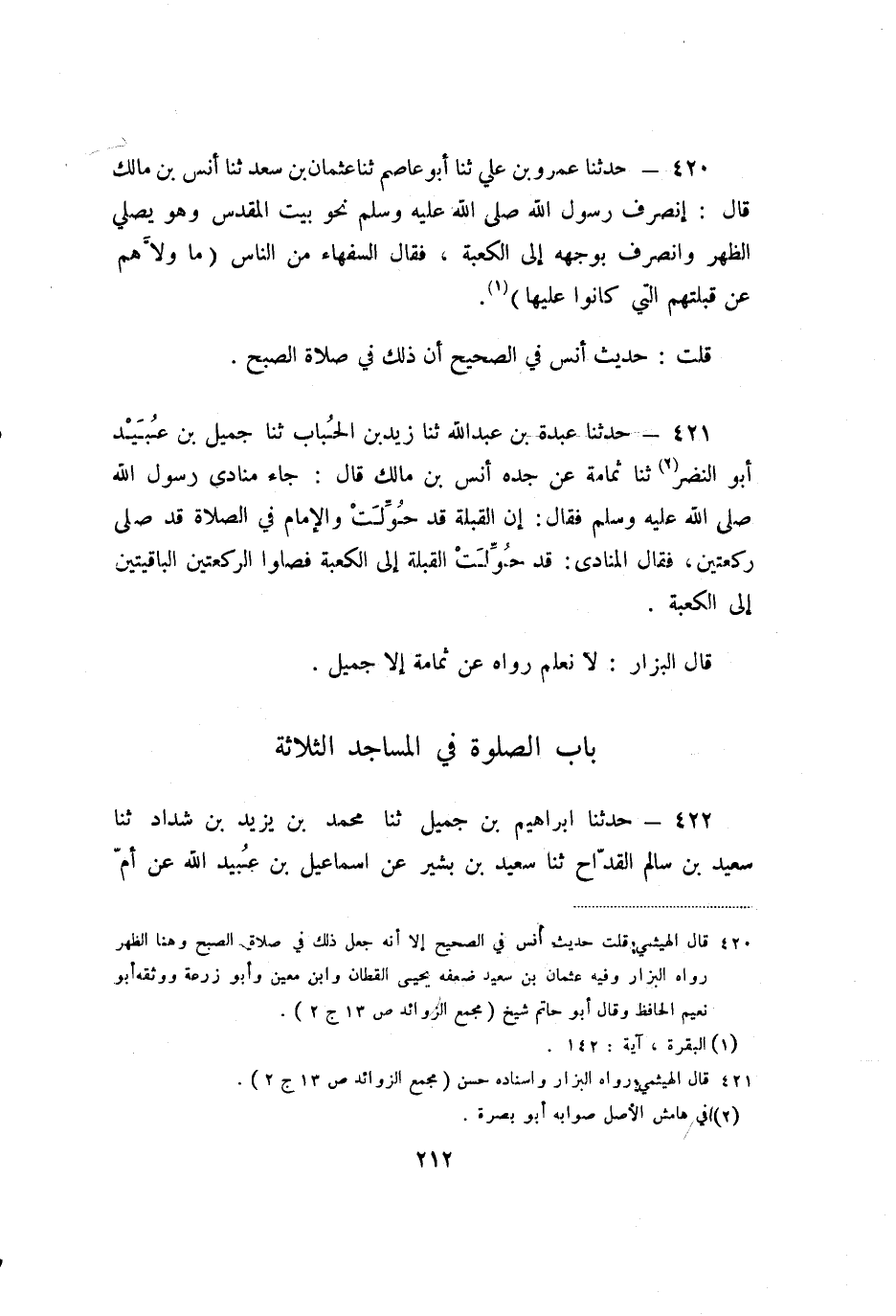 420 - حَدَّثَنَا عَمْرُو بْنُ عَلِيٍّ، ثنا أَبُو عَاصِمٍ، ثنا عُثْمَانُ بْنُ سَعْدٍ، ثنا أَنَسُ بْنُ مَالِكٍ، قَالَ: انْصَرَفَ رَسُولُ اللَّهِ صَلَّى اللَّهُ عَلَيْهِ وَسَلَّمَ نَحْوَ بَيْتِ الْمَقْدِسِ، وَهُوَ يُصَلِّي الظُّهْرَ، وَانْصَرَفَ بِوَجْهِهِ إِلَى الْكَعْبَةِ، فَقَالَ السُّفَهَاءُ مِنَ النَّاسِ: {مَا وَلَّاهُمْ عَنْ قِبْلَتِهِمُ الَّتِي كَانُوا عَلَيْهَا} [البقرة: 142] .