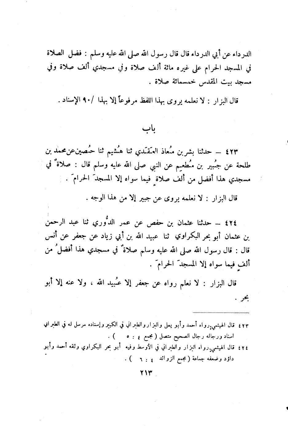 423 - حَدَّثَنَا بِشْرُ بْنُ مُعَاذٍ الْعَقَدِيُّ، ثنا هُشَيْمٌ، ثنا حُصَيْنٌ، عَنْ مُحَمَّدِ بْنِ طَلْحَةَ، عَنْ جُبَيْرِ بْنِ مُطْعِمٍ، عَنِ النَّبِيِّ صَلَّى اللَّهُ عَلَيْهِ وَسَلَّمَ، قَالَ: «صَلاةٌ فِي مَسْجِدِي هَذَا أَفْضَلُ مِنْ أَلْفِ صَلاةٍ فِيمَا سِوَاهُ إِلا الْمَسْجِدَ الْحَرَامَ» .