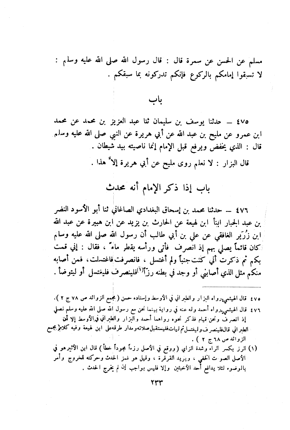476 - حَدَّثَنَا مُحَمَّدُ بْنُ إِسْحَاقَ الْبَغْدَادِيُّالصَّاغَانِيُّ، ثنا أَبُو الأَسْوَدِ النَّضْرُ بْنُ عَبْدِ الْجَبَّارِ، أنبا ابْنُ لَهِيعَةَ، عَنِ الْحَارِثِ بْنِ يَزِيدَ، عَنِ ابْنِ هُبَيْرَةَ، عَنْ عَبْدِ اللَّهِ بْنِ زَرِيرٍ الْغَافِقِيِّ، عَنْ عَلِيِّ بْنِ أَبِي طَالِبٍ، أَنَّ رَسُولَ اللَّهِ صَلَّى اللَّهُ عَلَيْهِ وَسَلَّمَ كَانَ قَائِمًا يُصَلِّي بِهِمْ إِذِ انْصَرَفَ، فَأَتَى وَرَأْسُهُ يَقْطُرُ مَاءً، فَقَالَ: «إِنِّي قُمْتُ بِكُمْ، ثُمَّ ذَكَرْتُ أَنِّي كُنْتُ جُنُبًا وَلَمْ أَغْتَسِلْ، فَانْصَرَفْتُ فَاغْتَسَلْتُ، فَمَنْ أَصَابَهُ مِنْكُمْ مِثْلُ الَّذِي أَصَابَنِي، أَوْ وَجَدَ فِي بَطْنِهِ رِزًّا فَلْيَنْصَرِفْ فَلْيَغْتَسِلْ أَوْ لِيَتَوَضَّأْ» .