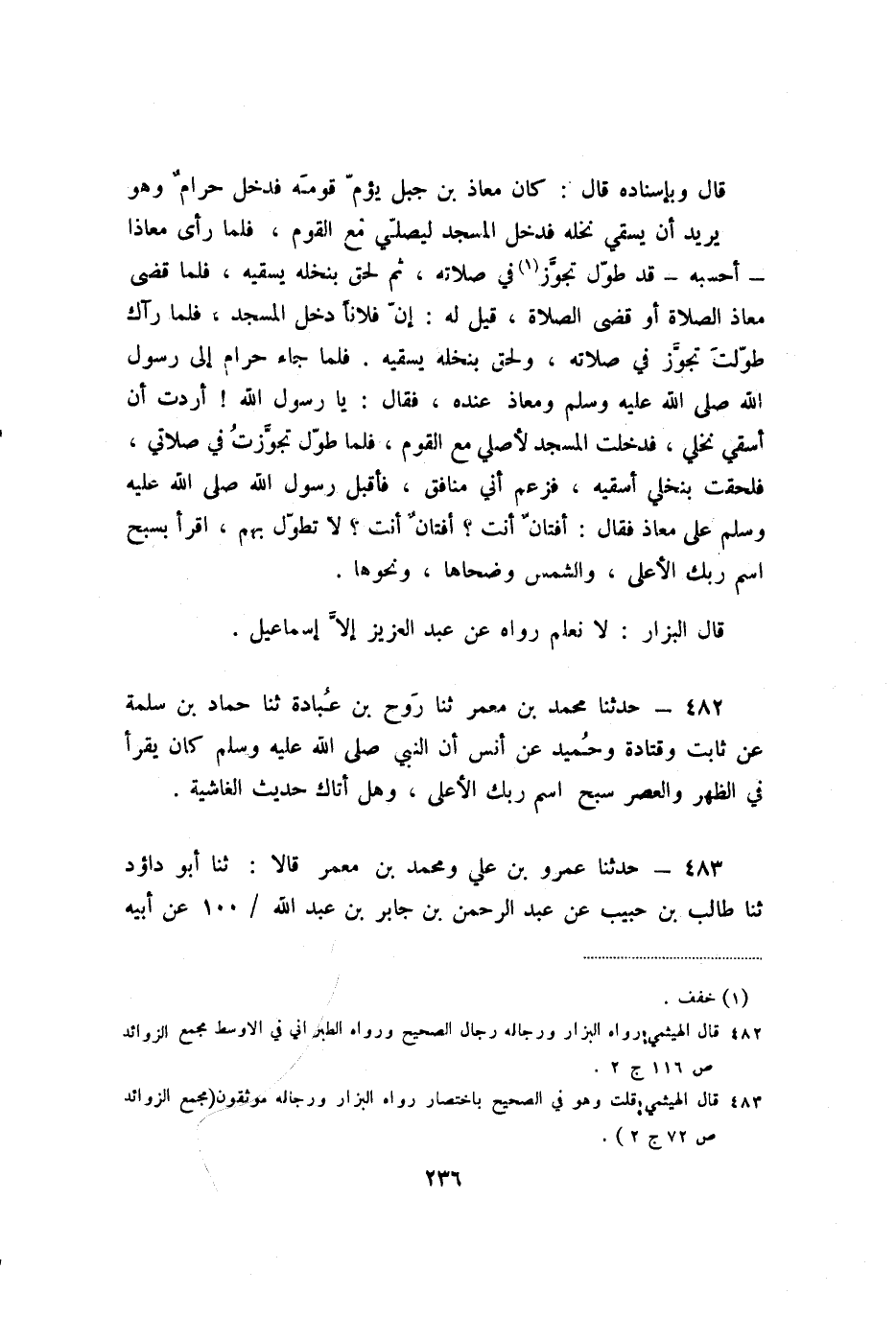 قَالَ: وَبِإِسْنَادِهِ قَالَ: كَانَ مُعَاذُ بْنُ جَبَلٍ يَؤُمُّ قَوْمَهُ، فَدَخَلَ حَرَامٌ، وَهُوَ يُرِيدُ أَنْ يَسْقِيَ نَخْلَهُ، فَدَخَلَ الْمَسْجِدَ لِيُصَلِّيَ مَعَ الْقَوْمِ، فَلَمَّا رَأَى مُعَاذًا أَحْسِبُهُ قَدْ طَوَّلَ تَجَوَّزَ فِي صَلاتِهِ، ثُمَّ لَحِقَ بِنَخْلِهِ يَسْقِيهِ، فَلَمَّا قَضَى مُعَاذٌ الصَّلاةَ، أَوْ قَضَى الصَّلاةَ، قِيلَ لَهُ: إِنَّ فُلانًا دَخَلَ الْمَسْجِدَ، فَلَمَّا رَآكَ طَوَّلْتَ تَجَوَّزَ فِي صَلاتِهِ، وَلَحِقَ بِنَخْلِهِ يَسْقِيهِ، فَلَمَّا جَاءَ حَرَامٌ إِلَى رَسُولِ اللَّهِ صَلَّى اللَّهُ عَلَيْهِ وَسَلَّمَ، وَمُعَاذٌ عِنْدَهُ، فَقَالَ: يَا رَسُولَ اللَّهِ! أَرَدْتُ أَنْ أَسْقِيَ نَخْلِي، فَدَخَلْتُ الْمَسْجِدَ لأُصَلِّيَ مَعَ الْقَوْمِ، فَلَمَّا طَوَّلَ تَجَوَّزْتُ فِي صَلاتِي، فَلَحِقْتُ بِنَخْلِي أَسْقِيهِ، فَزَعَمَ أَنِّي مُنَافِقٌ، فَأَقْبَلَ رَسُولُ اللَّهِ صَلَّى اللَّهُ عَلَيْهِ وَسَلَّمَ عَلَى مُعَاذٍ، فَقَالَ: «أَفَتَّانٌ أَنْتَ؟ أَفَتَّانٌ أَنْتَ؟ لا تُطَوِّلْ بِهِمْ، اقْرَأْ بِ سَبِّحِ اسْمَ رَبِّكَ الأَعْلَى، وَالشَّمْسِ وَضُحَاهَا، وَنَحْوِهَا» .