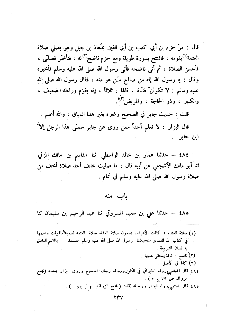 قَالَ: مَرَّ حَزْمُ بْنُ أَبِي كَعْبِ بْنِ أَبِي الْقَيْنِ بِمُعَاذِ بْنِ جَبَلٍ، وَهُوَ يُصَلِّي صَلاةَ الْعَتَمَةِ بِقَوْمِهِ، فَافْتَتَحَ بِسُورَةٍ طَوِيلَةٍ، وَمَعَ حَزْمٌ نَاضِحٌ لَهُ، فَتَأَخَّرَ فَصَلَّى، فَأَحْسَنَ الصَّلاةَ، ثُمَّ أَتَى نَاضِحَهُ، فَأَتَى رَسُولَ اللَّهِ صَلَّى اللَّهُ عَلَيْهِ وَسَلَّمَ فَأَخْبَرَهُ، وَقَالَ: يَا رَسُولَ اللَّهِ إِنَّهُ مِنْ صَالِحِ مَنْ هُوَ مِنْهُ، فَقَالَ رَسُولُ اللَّهِ صَلَّى اللَّهُ عَلَيْهِ وَسَلَّمَ: " لا تَكُونَنَّ فَتَّانًا قَالَهَا: ثَلاثًا إِنَّهُ يَقُومُ وَرَاءَكَ الضَّعِيفُ، وَالْكَبِيرُ، وَذُو الْحَاجَةِ، وَالْمَرِيضُ ".