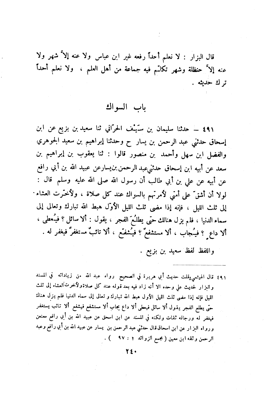 491 - حَدَّثَنَا سُلَيْمَانُ بْنُ سَيْفٍ الْحَرَّانِيُّ، ثنا سَعِيدُ بْنُ بَزِيعٍ، عَنِ ابْنِ إِسْحَاقَ، حَدَّثَنِي عَبْدُ الرَّحْمَنِ بْنُ يَسَارٍ، ح، وَحَدَّثَنَا إِبْرَاهِيمُ بْنُ سَعِيدٍ الْجَوْهَرِيُّ، وَالْفَضْلُ بْنُ سَهْلٍ، وَأَحْمَدُ بْنُ مَنْصُورٍ، قَالُوا: ثنا يَعْقُوبُ بْنُ إِبْرَاهِيمَ بْنِ سَعْدٍ، عَنْ أَبِيهِ ابْنِ إِسْحَاقَ، حَدَّثَنِي عَبْدُ الرَّحْمَنِ بْنُ يَسَارٍ، عَنْ عُبَيْدِ اللَّهِ بْنِ أَبِي رَافِعٍ، عَنْ أَبِيهِ، عَنْ عَلِيِّ بْنِ أَبِي طَالِبٍ، أَنَّ رَسُولَ اللَّهِ صَلَّى اللَّهُ عَلَيْهِ وَسَلَّمَ قَالَ: " لَوْلا أَنْ أَشُقَّ عَلَى أُمَّتِي لأَمَرْتُهُمْ بِالسِّوَاكِ عِنْدَ كُلِّ صَلاةٍ، وَلأَخَّرْتُ الْعِشَاءَ إِلَى ثُلُثِ اللَّيْلِ، فَإِنَّهُ إِذَا مَضَى ثُلُثُ اللَّيْلِ الأَوَّلُ هَبَطَ اللَّهُ تَبَارَكَ وَتَعَالَى إِلَى سَمَاءِ الدُّنْيَا، فَلَمْ يَزَلْ هُنَالِكَ حَتَّى يَطْلُعَ الْفَجْرُ، يَقُولُ: أَلا سَائِلٌ فَيُعْطَى؟ ، أَلا دَاعٍ فَيُجَابُ؟ ، أَلا مُسْتَشْفِعٌ فَيُشَفَّعُ؟ ، أَلا تَائِبٌ مُسْتَغْفِرٌ فَيُغْفَرُ لَهُ؟ ".