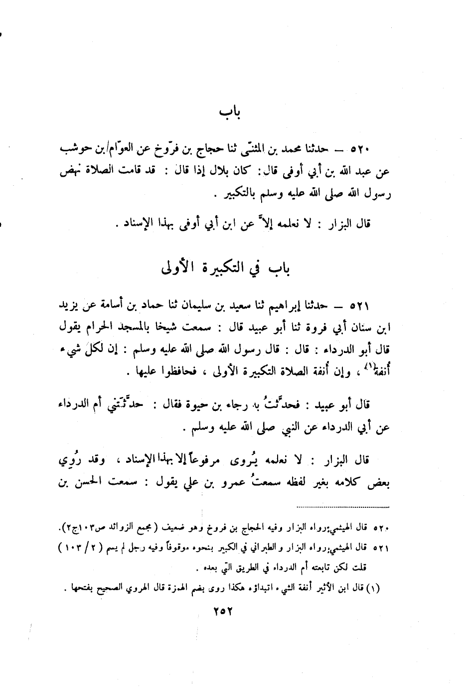 521 - حَدَّثَنَا إِبْرَاهِيمُ، ثنا سَعِيدُ بْنُ سُلَيْمَانَ، ثنا حَمَّادُ بْنُ أُسَامَةَ، عَنْ يَزِيدَ بْنِ سِنَانٍ أَبِي فَرْوَةَ، ثنا أَبُو عُبَيْدٍ، قَالَ: سَمِعْتُ شَيْخًا بِالْمَسْجِدِ الْحَرَامِ يَقُولُ: قَالَ أَبُو الدَّرْدَاءِ: قَالَ: قَالَ رَسُولُ اللَّهِ صَلَّى اللَّهُ عَلَيْهِ وَسَلَّمَ: «إِنَّ لِكُلِّ شَيْءٍ أُنْفَةً، وَإِنَّ أُنْفَةَ الصَّلاةِ التَّكْبِيرَةُ الأُولَى، فَحَافِظُوا عَلَيْهَا» .