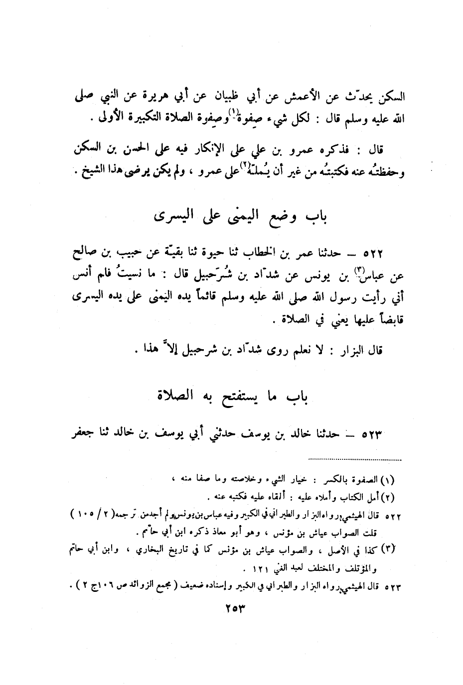 522 - حَدَّثَنَا عُمَرُ بْنُ الْخَطَّابِ، ثنا حَيْوَةُ، ثنا بَقِيَّةُ، عَنْ حَبِيبِ بْنِ صَالِحٍ، عَنْ عَبَّاسِ بْنِ يُونُسَ، عَنْ شَدَّادِ بْنِ شُرَحْبِيلَ، قَالَ: مَا نَسِيتُ فَلَمْ أَنْسَ أَنِّي رَأَيْتُ رَسُولَ اللَّهِ صَلَّى اللَّهُ عَلَيْهِ وَسَلَّمَ قَائِمًا؛ يَدُهُ الْيُمْنَى عَلَى يَدِهِ الْيُسْرَى قَابِضًا عَلَيْهَا، يَعْنِي: فِي الصَّلاةِ.
