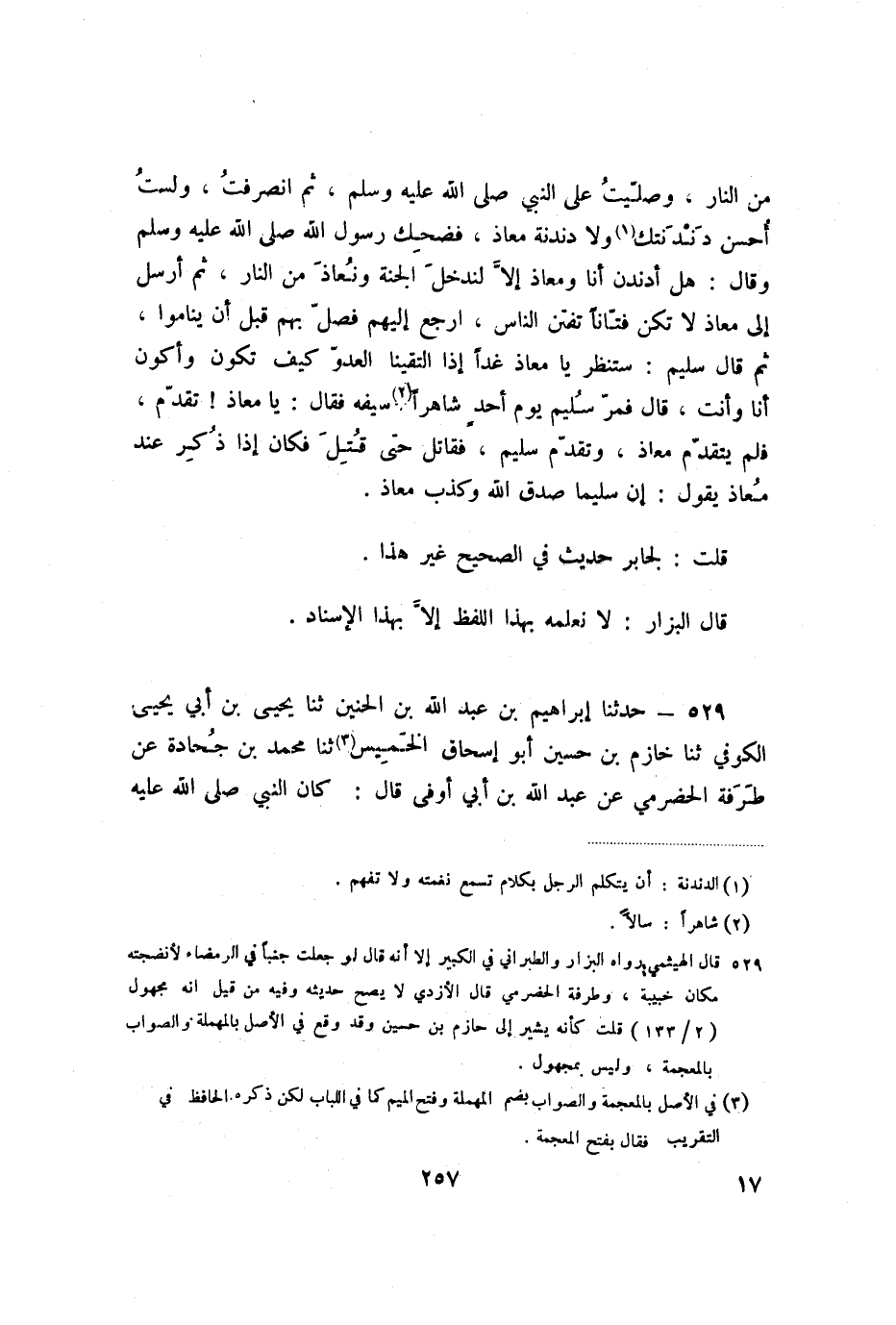 529 - حَدَّثَنَا إِبْرَاهِيمُ بْنُ عَبْدِ اللَّهِ بْنِ الْحُنَيْنِ، ثنا يَحْيَى بْنُ أَبِي يَحْيَى الْكُوفِيُّ، ثنا خَازِمُ بْنُ حُسَيْنٍ أَبُو إِسْحَاقَ الْحُمَيْسُ، ثنا مُحَمَّدُ بْنُ جُحَادَةَ، عَنْ طَرَفَةَ الْحَضْرَمِيِّ، عَنْ عَبْدِ اللَّهِ بْنِ أَبِي أَوْفَى، قَالَ: كَانَ النَّبِيُّ صَلَّى اللَّهُ عَلَيْهِ