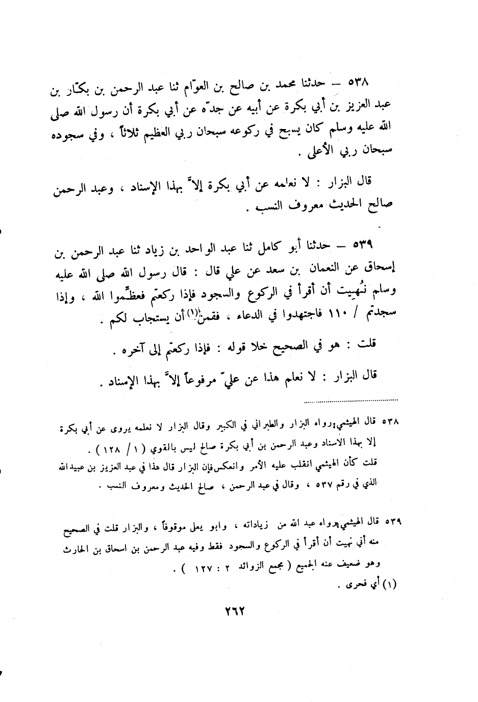 قَالَ الْبَزَّارُ: لا نَعْلَمُهُ عَنْ أَبِي بَكْرَةَ إِلا بِهَذَا الإِسْنَادِ، وَعَبْدُ الرَّحْمَنِ صَالِحُ الْحَدِيثِ مَعْرُوفُ النَّسَبِ.