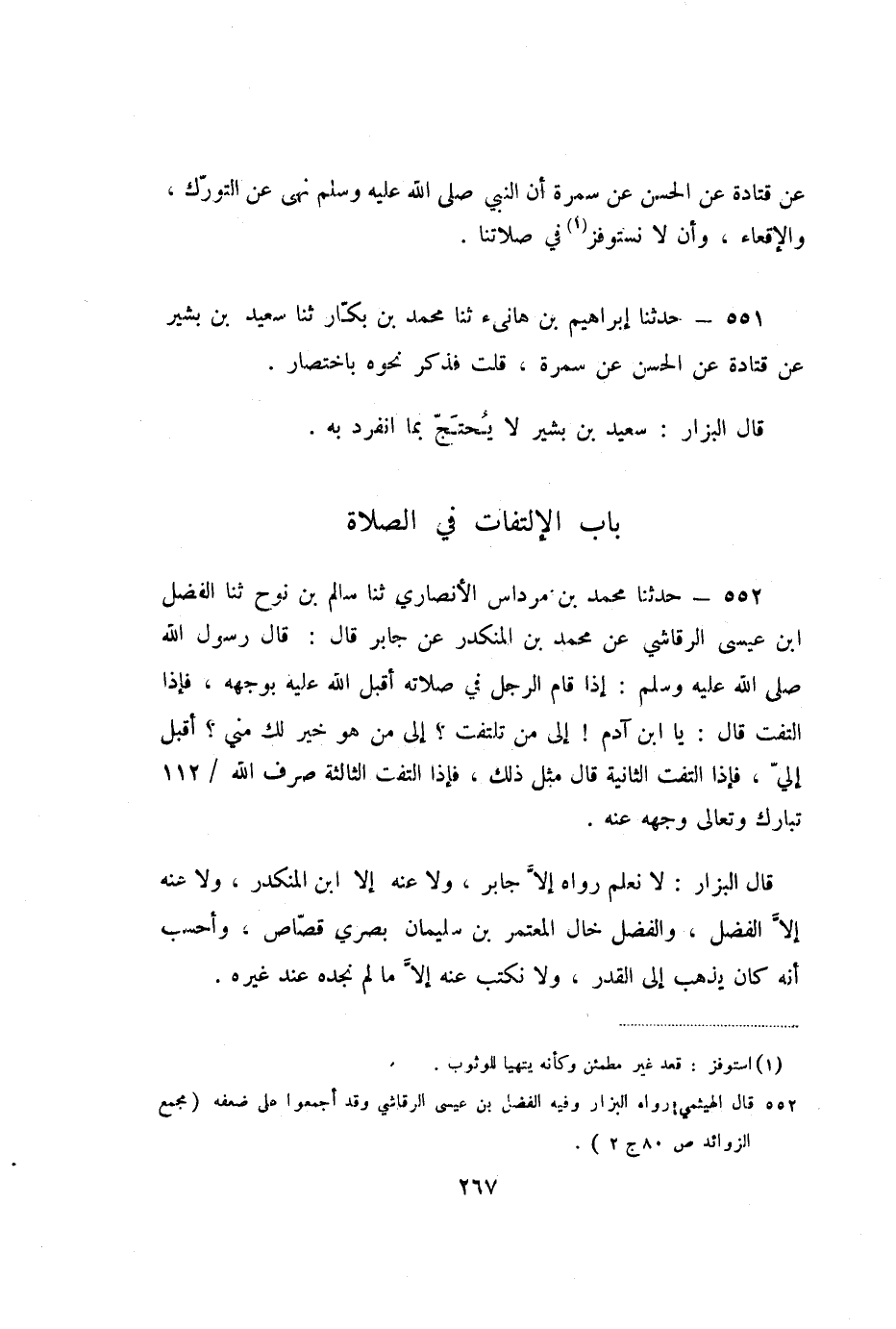 552 - حَدَّثَنَا مُحَمَّدُ بْنُ مِرْدَاسٍ الأَنْصَارِيُّ، ثنا سَالِمُ بْنُ نُوحٍ، ثنا الْفَضْلُ بْنُ عِيسَى الرَّقَاشِيُّ، عَنْ مُحَمَّدِ بْنِ الْمُنْكَدِرِ، عَنْ جَابِرٍ، قَالَ: قَالَ رَسُولُ اللَّهِ صَلَّى اللَّهُ عَلَيْهِ وَسَلَّمَ: " إِذَا قَامَ الرَّجُلُ فِي صَلاتِهِ أَقْبَلَ اللَّهُ عَلَيْهِ بِوَجْهِهِ، فَإِذَا الْتَفَتَ قَالَ: يَا ابْنَ آدَمَ! إِلَى مَنْ تَلْتَفِتُ؟ إِلَى مَنْ هُوَ خَيْرٌ لَكَ مِنِّي؟ أَقْبِلْ إِلَيَّ، فَإِذَا الْتَفَتَ الثَّانِيَةَ قَالَ مِثْلَ ذَلِكَ، فَإِذَا الْتَفَتَ الثَّالِثَةَ صَرَفَ اللَّهُ تَبَارَكَ وَتَعَالَى وَجْهَهُ عَنْهُ ".