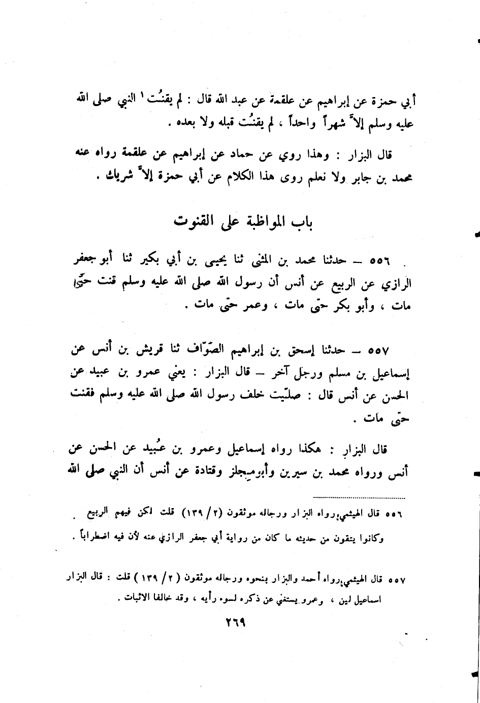 557 - حَدَّثَنَا إِسْحَاقُ بْنُ إِبْرَاهِيمَ الصَّوَّافُ، ثنا قُرَيْشُ بْنُ أَنَسٍ، عَنْ إِسْمَاعِيلَ بْنِ مُسْلِمٍ وَرَجُلٌ آخَرُ قَالَ الْبَزَّارُ: يَعْنِي عَمْرَو بْنَ عُبَيْدٍ، عَنِ الْحَسَنِ، عَنْ أَنَسٍ، قَالَ: صَلَّيْتُ خَلْفَ رَسُولِ اللَّهِ صَلَّى اللَّهُ عَلَيْهِ وَسَلَّمَ فَقَنَتَ حَتَّى مَاتَ.