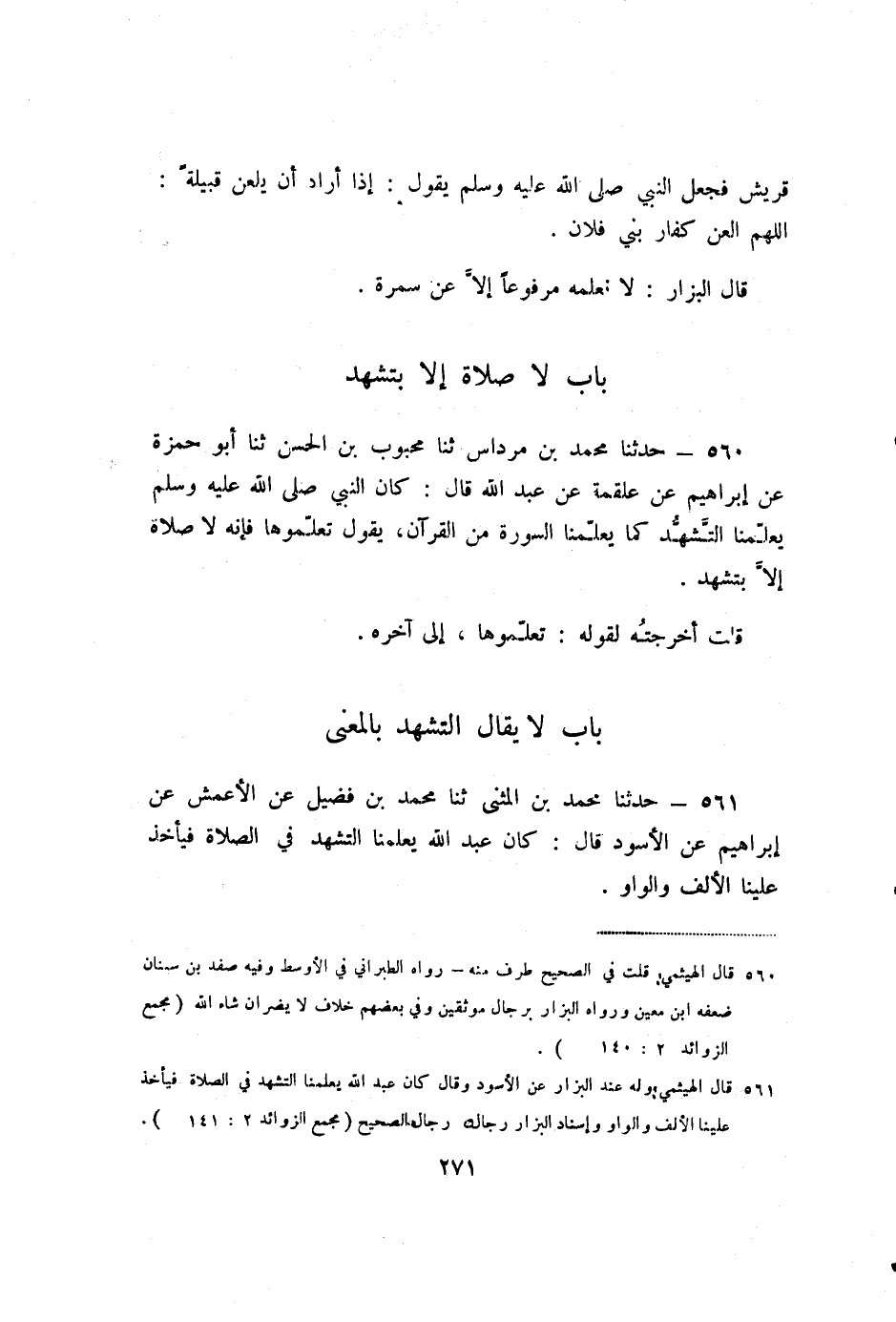 561 - حَدَّثَنَا مُحَمَّدُ بْنُ الْمُثَنَّى، ثنا مُحَمَّدُ بْنُ فُضَيْلٍ، عَنِ الأَعْمَشِ، عَنْ إِبْرَاهِيمَ، عَنِ الأَسْوَدِ، قَالَ: كَانَ عَبْدُ اللَّهِ يُعَلِّمُنَا التَّشَهُّدَ فِي الصَّلاةِ، فَيَأْخُذُ عَلَيْنَا الأَلِفَ وَالْوَاوَ.